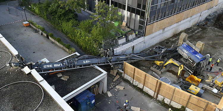 Auf einer Baustelle ist am Dienstag ein 160 Tonnen schweres Bohrgerät umgestürzt. Der 56-jährige Fahrzeugführer wurde dabei leicht verletzt.