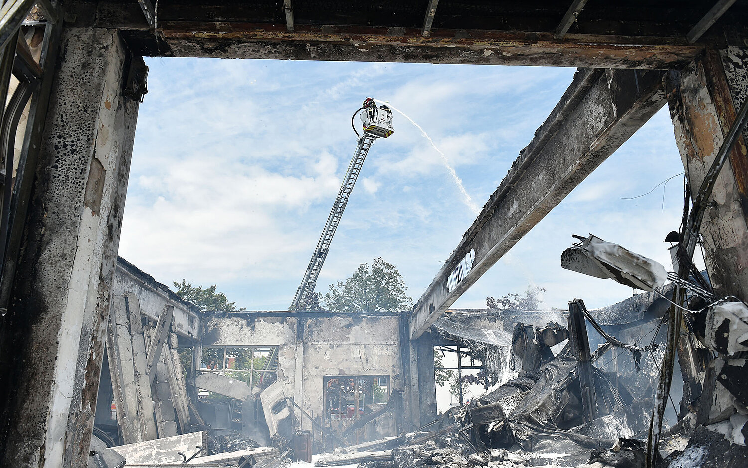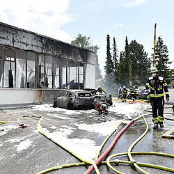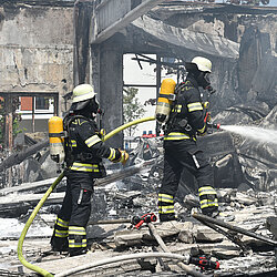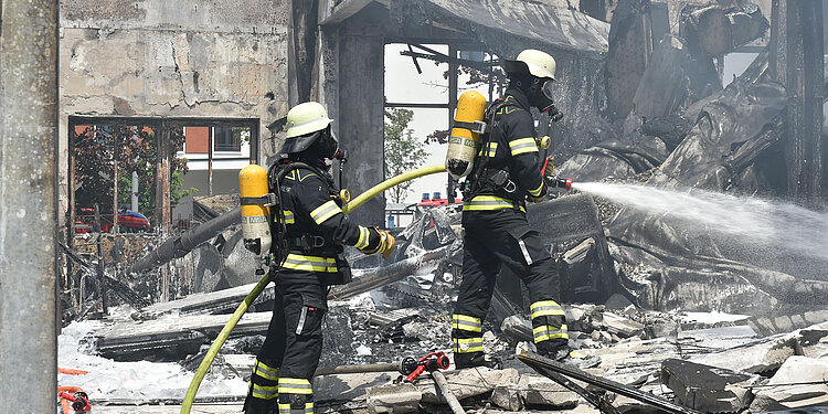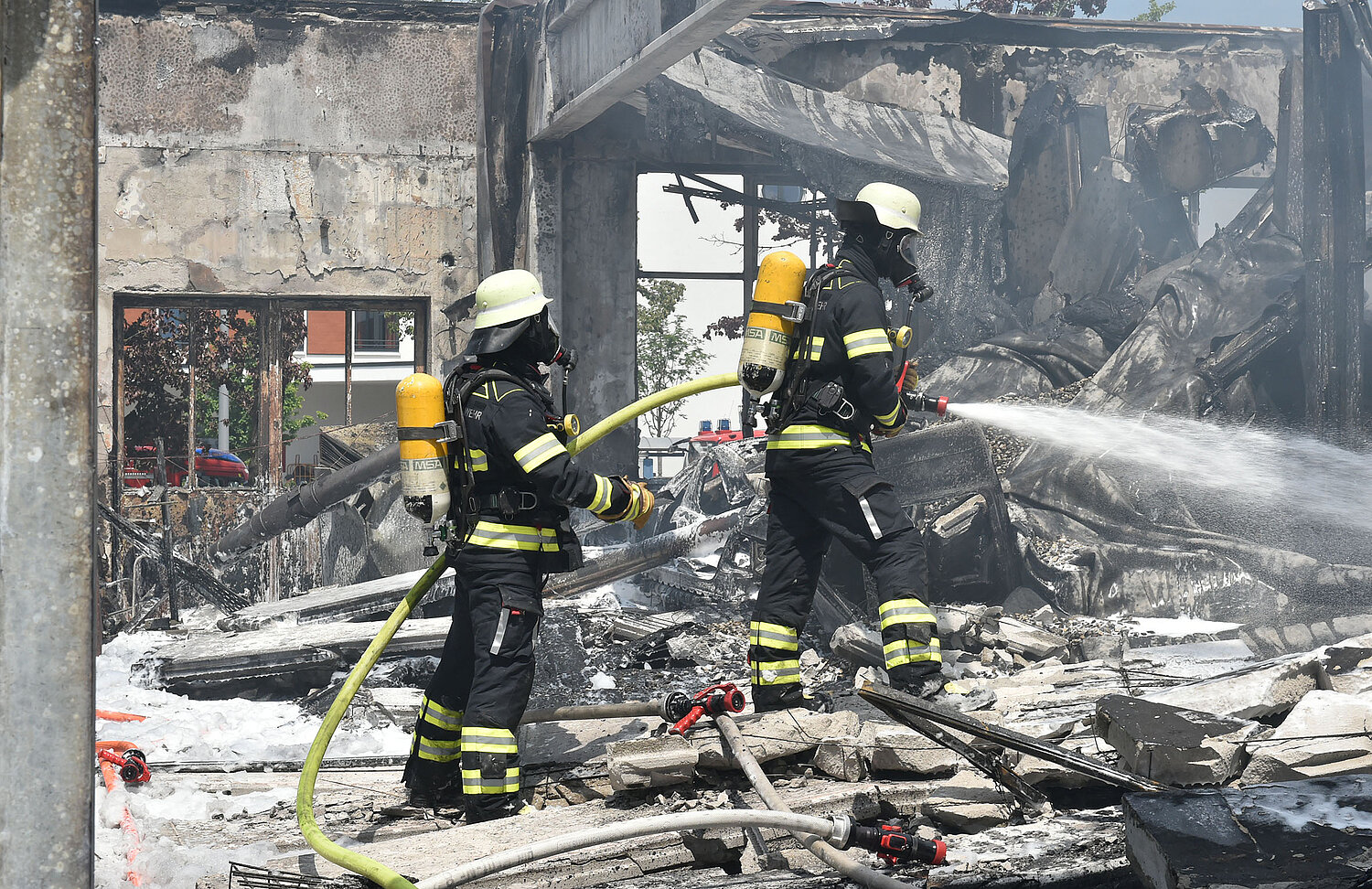 Sofort löschten mehrere Trupps mit bis zu acht C- und zwei B-Rohren. Sogar ein am Korb der Drehleiter montierter Wasserwerfer kam zum Einsatz. Dieser massive Löschangriff zeigte nach rund einer Stunde Wirkung und die Flammen waren in Gewalt. Es dauert aber weitere zwei Stunden, bis der Einsatzleiter „Feuer aus!“ melden konnte.