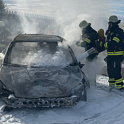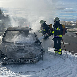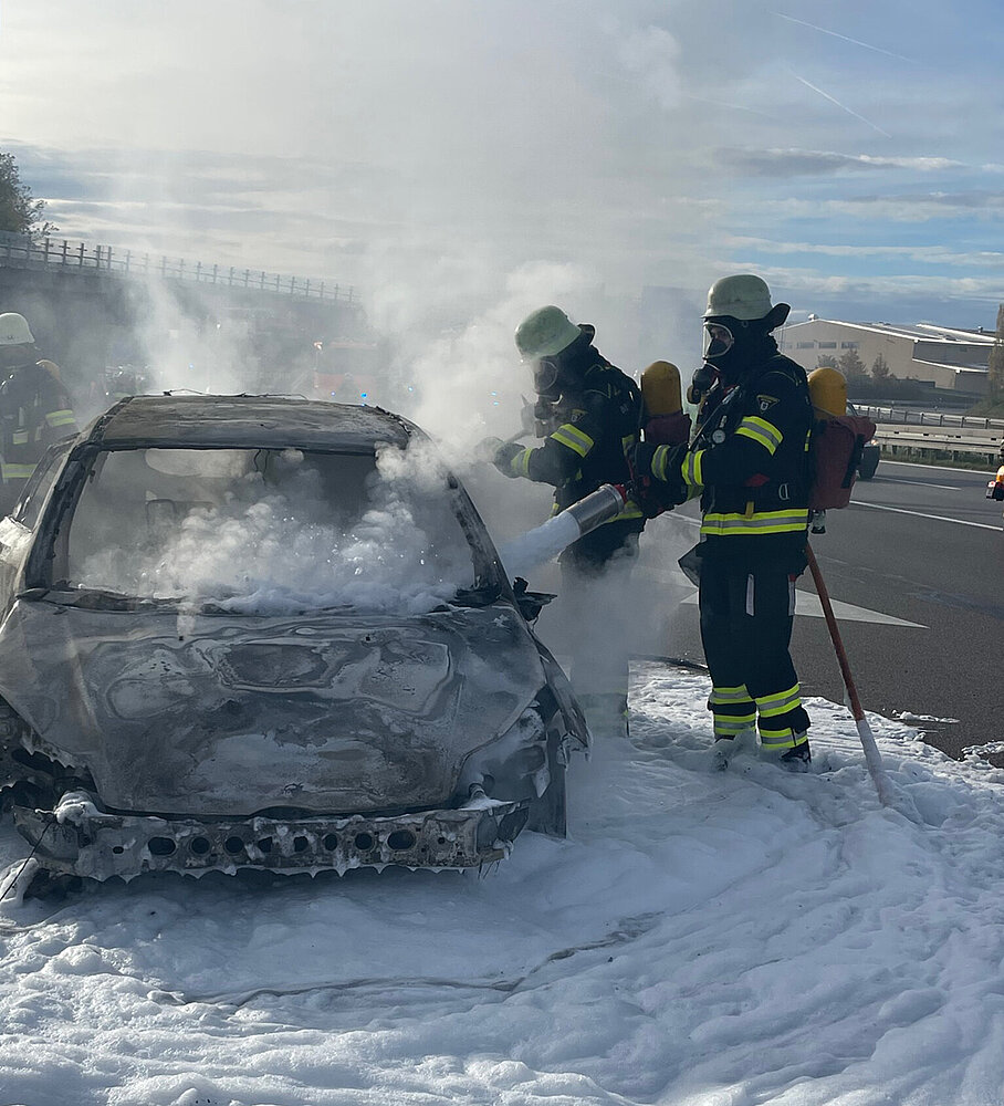 Bereits auf der Anfahrt konnten die Einsatzkräfte eine weithin sichtbare schwarze Rauchwolke erkennen. Als sie die Einsatzstelle erreichten, stand der Pkw bereits vollkommen in Brand.