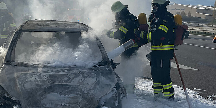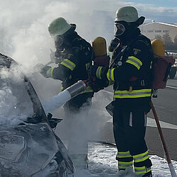 Sofort setzten die Einsatzkräfte von Freiwilliger Feuerwehr und Berufsfeuerwehr zwei Löschrohre ein, um den Pkw abzulöschen. Sie verwendeten hierbei auch einen Schaumaufsatz, um einen schnellen Löscherfolgt zu erzielen. Dies gelang nach wenigen Minuten.