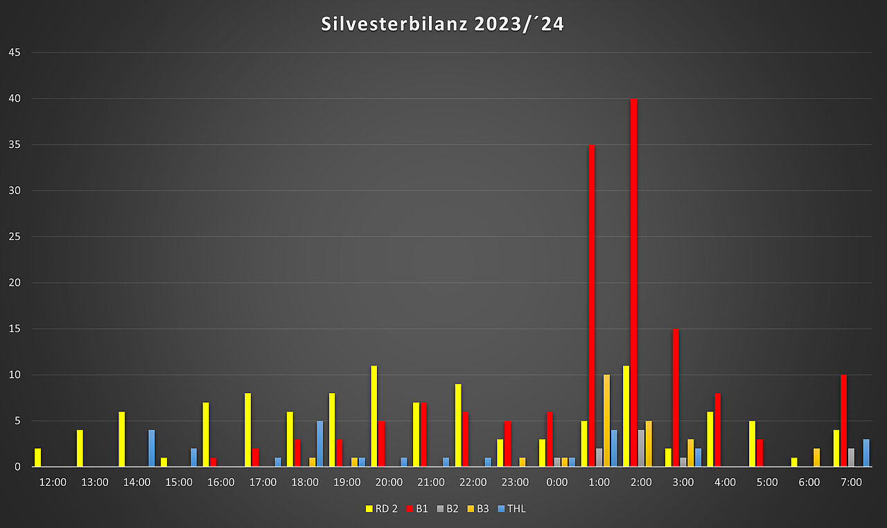 Auch für die Rettungsdienstkräfte gab es wieder jede Menge zu tun. Glücklicherweise kam es in diesem Jahr nicht zu besonders schweren Verletzungen durch Pyrotechnik. Dennoch rückten die notarztbesetzen Fahrzeuge der Feuerwehr im Betrachtungszeitraum von 12.00 Uhr bis 7.00 Uhr morgens zu über 100 Einsätzen aus. Übermäßiger Alkoholkonsum war häufig die Ursache für Stürze, Verletzungen und Streitigkeiten.