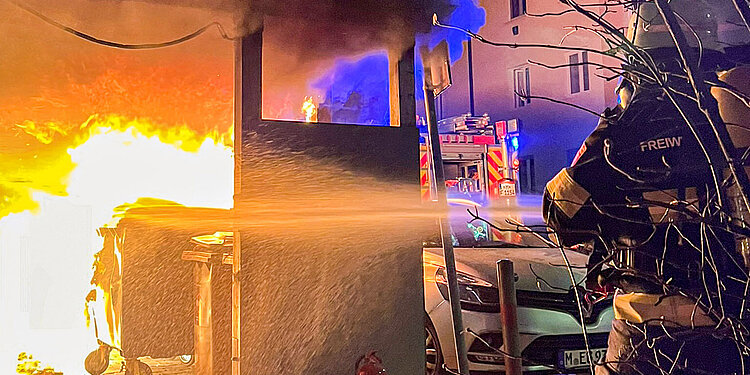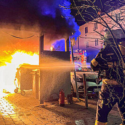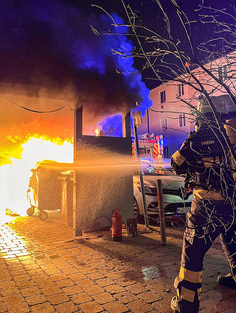 In den frühen Morgenstunden kam es um 4:45 Uhr zu einem größeren Brandereignis in der Parkstadt Solln. Bei Eintreffen des Löschzuges der Feuerwehr standen bereits zwei Pkw sowie ein Nebengebäude mit mehreren Mülltonnen in Vollbrand. Mit mehreren Löschrohren wurde ein umfangreicher Löschangriff eingeleitet. Die Bewohnerinnen und Bewohner des Mehrparteienhauses wurden während der Löscharbeiten in einem Großraumrettungswagen untergebracht und betreut. Nach den Löscharbeiten musste ein Teil der Gebäudedämmung zur Kontrolle geöffnet werden. Glücklicherweise breitete sich das Feuer nicht auf die Wärmedämmung des Hauses aus. Das Wohnhaus musste mit einem Hochleistungslüfter entraucht werden, da bei dem Feuer Rauch eindrang. Im Anschluss konnten die Bewohner wieder in ihre Wohnungen zurückkehren. Bei einer Nachsicht an der Einsatzstelle mussten nochmals Kleinteile des völlig zerstörten Müllhauses abgelöscht werden, da sich hier das Feuer nochmals entzündete.