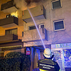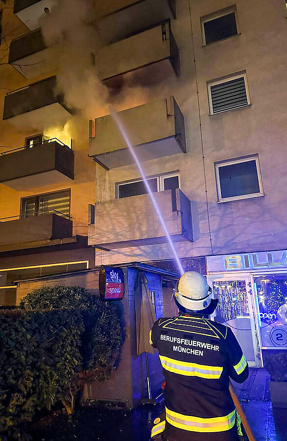 Den ersten größeren Feuerwehreinsatz gab es in Perlach um 18:21 Uhr. Hier kam es in einem Hochhaus durch eine Feuerwerksrakete zu einem massiven Balkonbrand. Dabei platzte durch die Hitzeeinwirkung die Fensterscheibe. Die Mieterin verletzte sich bei den Löscharbeiten. Sie musste mit schweren Verbrennungen in eine Münchner Klinik transportiert werden. Die Feuerwehr konnte ein Übergreifen der Flammen auf die Wohnung und den darüberliegenden Balkon gerade noch rechtzeitig verhindern. Dennoch mussten mehrere Etagen wegen der Verrauchung kontrolliert und anschließend mit einem Hochleistungslüfter entraucht werden. Im Anschluss wurde die zerborstene Fensterscheibe von den Feuerwehrleuten verschlossen. Der Einsatz dauerte knapp zwei Stunden.