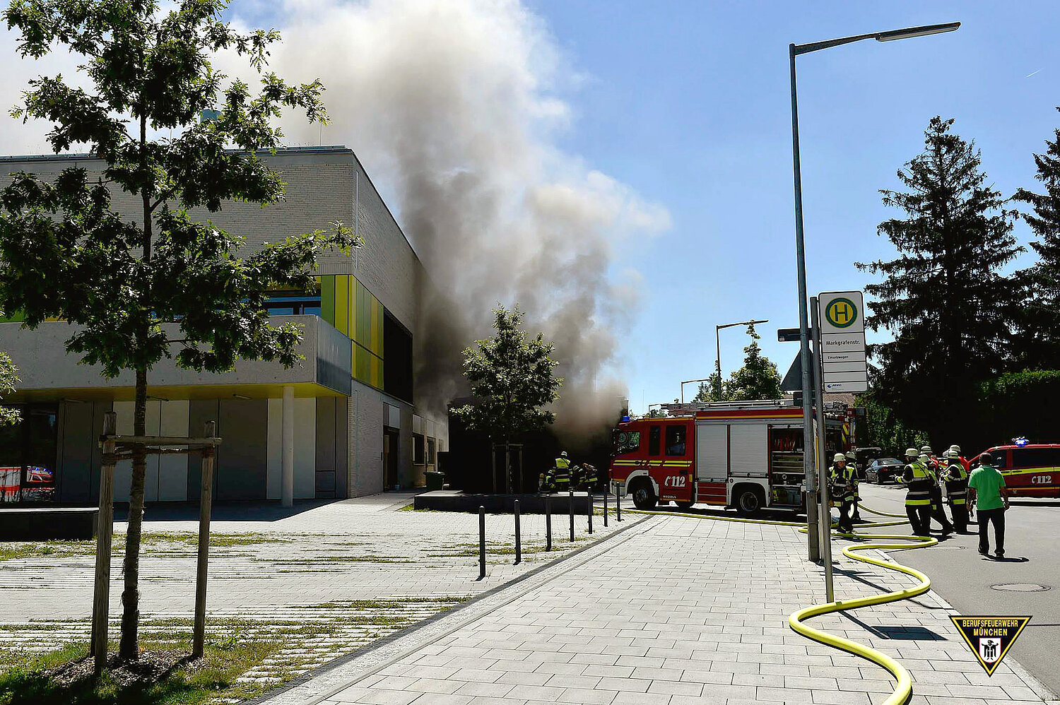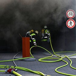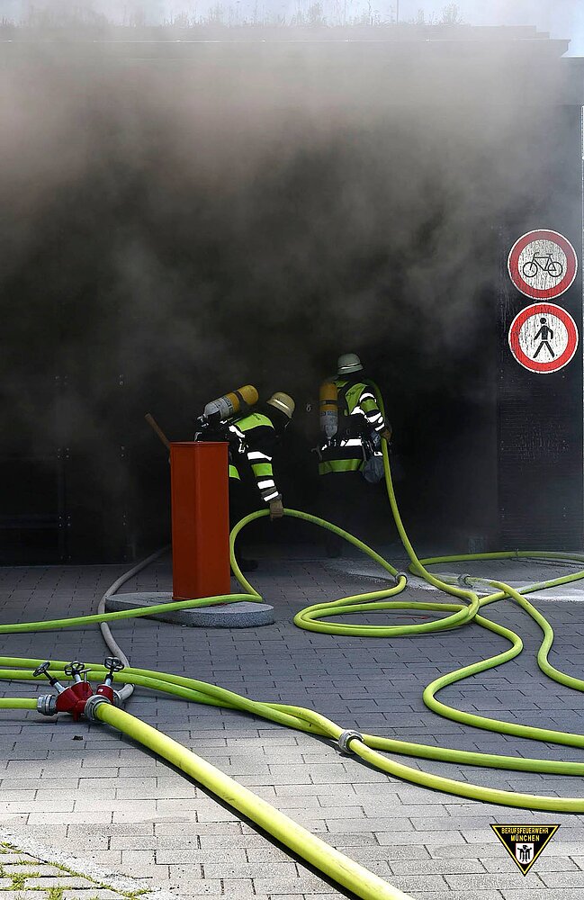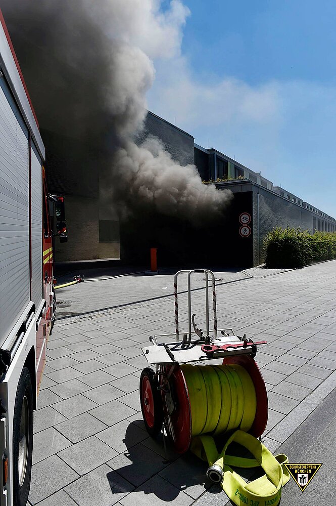 Die starke Rauchentwicklung aus der Tiefgarage einer Schule an der Friedenspromenade zeigte den anfahrenden Einsatzkräften bereits von weitem den Weg. Da die Schule bereits durch die ausgelöste Brandmeldeanlage vorbildlich von den Lehrkräften geräumt wurde, konnten sich die ersten Feuerwehrbeamten auf die Löscharbeiten in der Tiefgarage konzentrieren. Geschützt unter Atemschutz gingen mehrere Trupps zur Brandbekämpfung in das Gebäude vor.