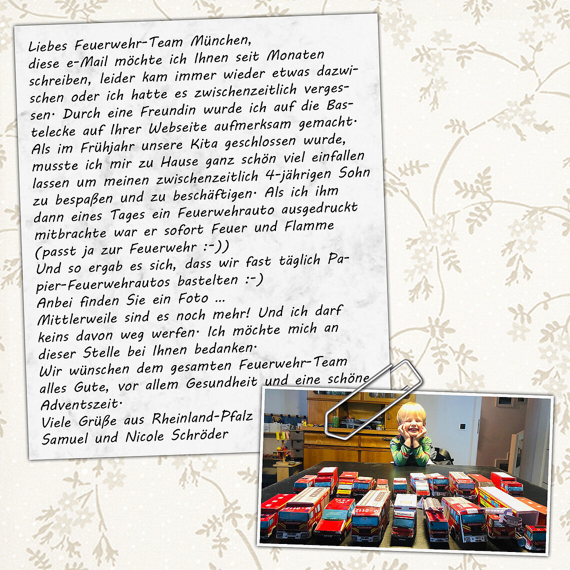 Wir freuen uns immer über Rückmeldungen – ob nun Lob oder Kritik. Besonders haben wir uns aber über das Schreiben gefreut, das uns vom feuerwehrbegeisterten Samuel erreicht hat. Nicht nur einen Löschzug hat Samuel mit unseren Bastelbögen selbst gebastelt, sondern einen kompletten Feuerwehr-Fahrzeugpark. Samuel, wir sind begeistert!