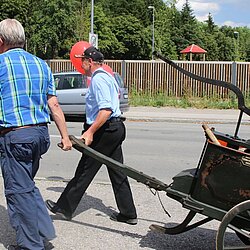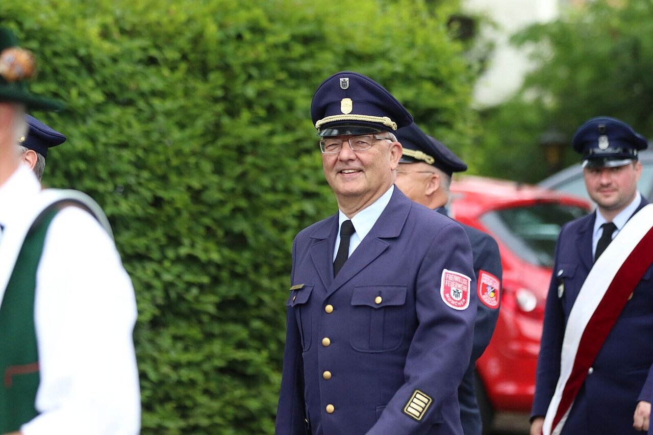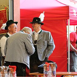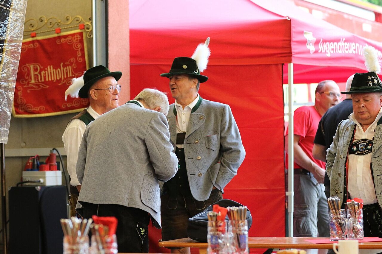 Schon um 7 Uhr morgens begannen die Vorbereitungen für diesen Festtag. Die Halle wurde gefegt und die Küche regenfest gemacht. Ab 9 Uhr trafen dann auch die restlichen Teilnehmer des Festumzugs am Gerätehaus ein. Bei Kas-Kas und Weißwurst wurde sich dann für den Umzug gestärkt.