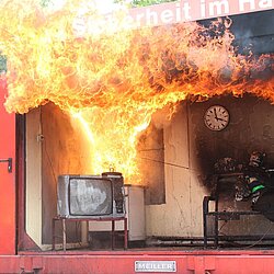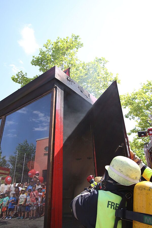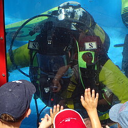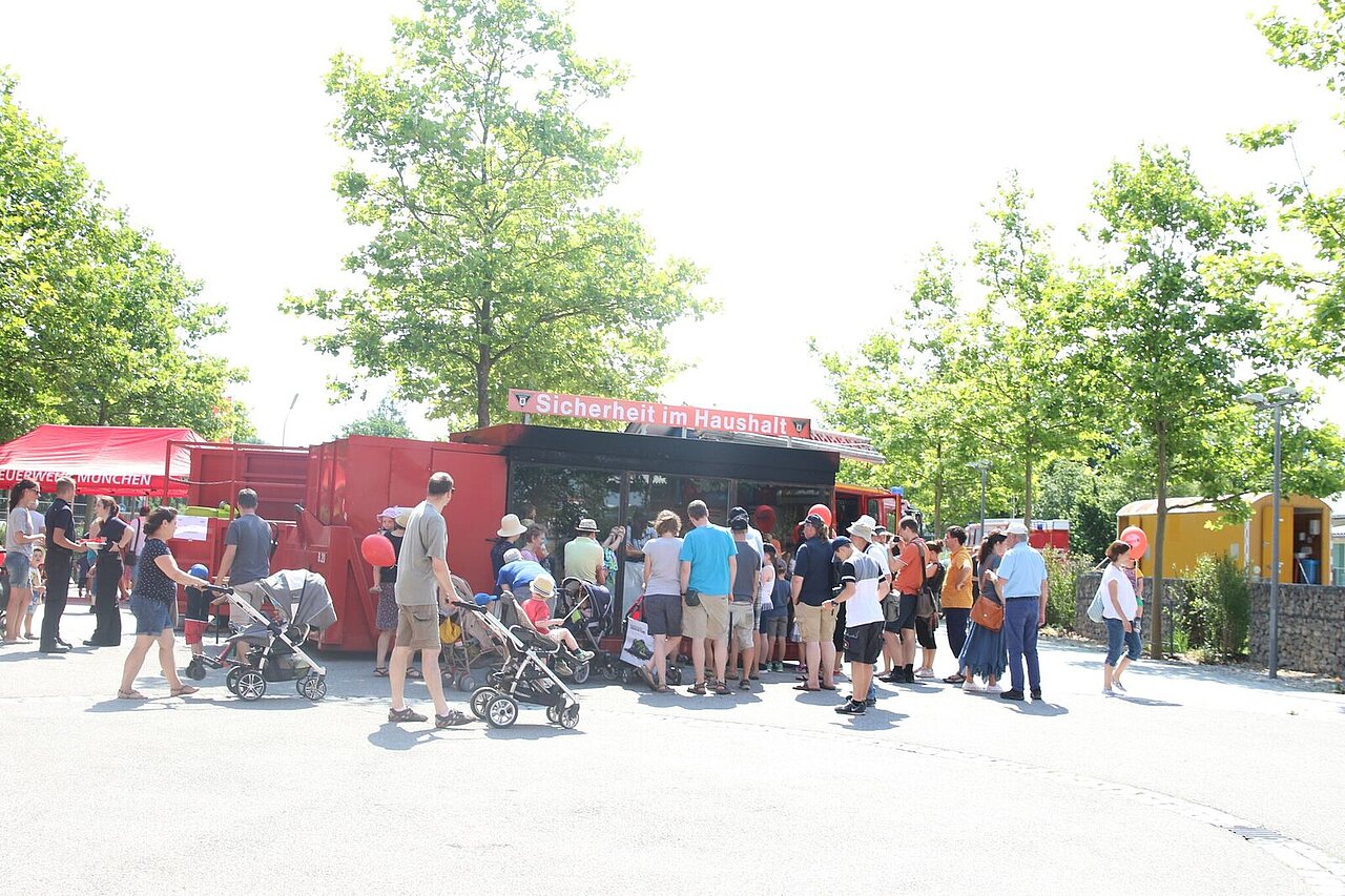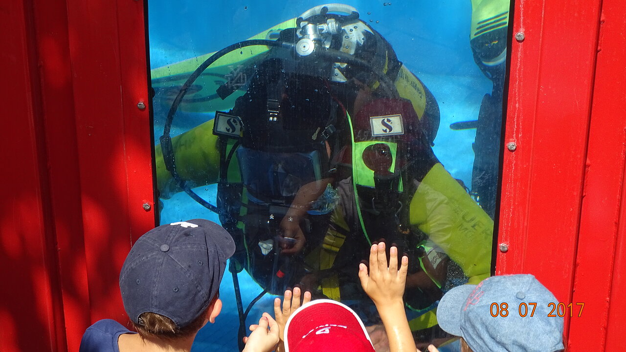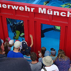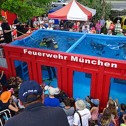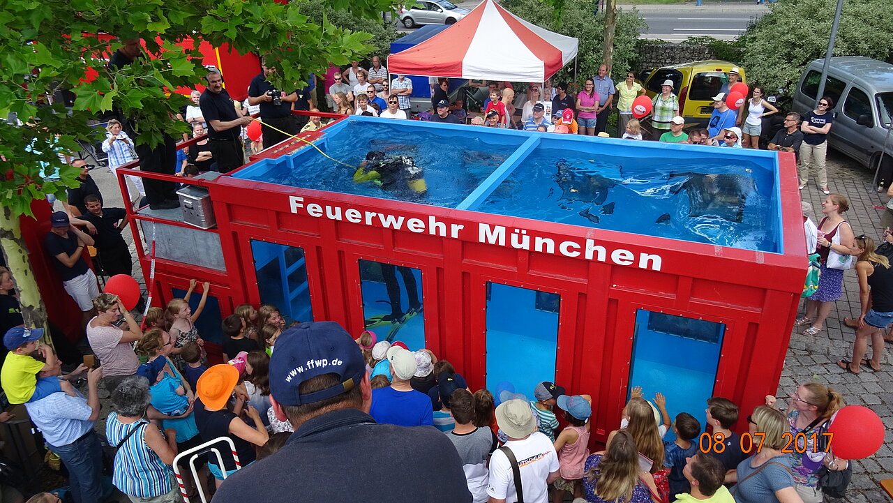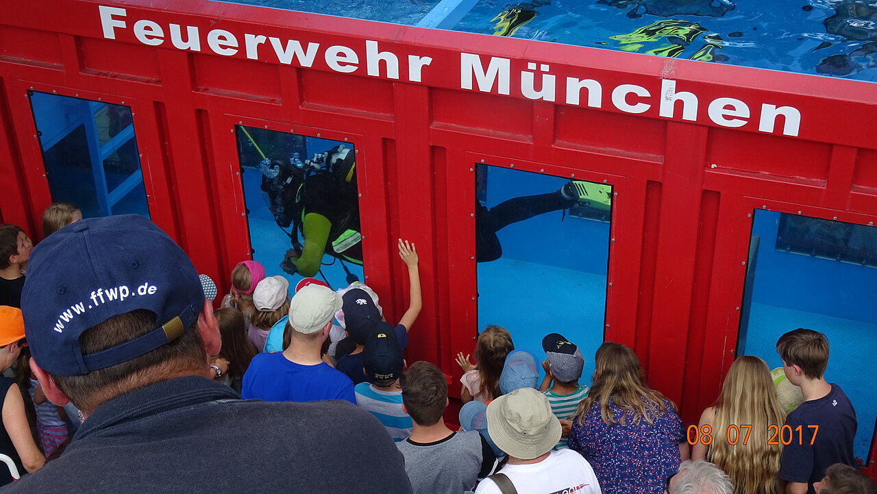 Im Laufe des Tages gab es viele Vorführungen, wie technische Rettung nach einem Verkehrsunfall, Fettexplosion und Zimmerbrand. Sogar die Taucher der Berufsfeuerwache 5 in Ramersdorf waren zu Besuch und zeigten ihr ganzes Können in einem speziellem Container mit Fenstern.