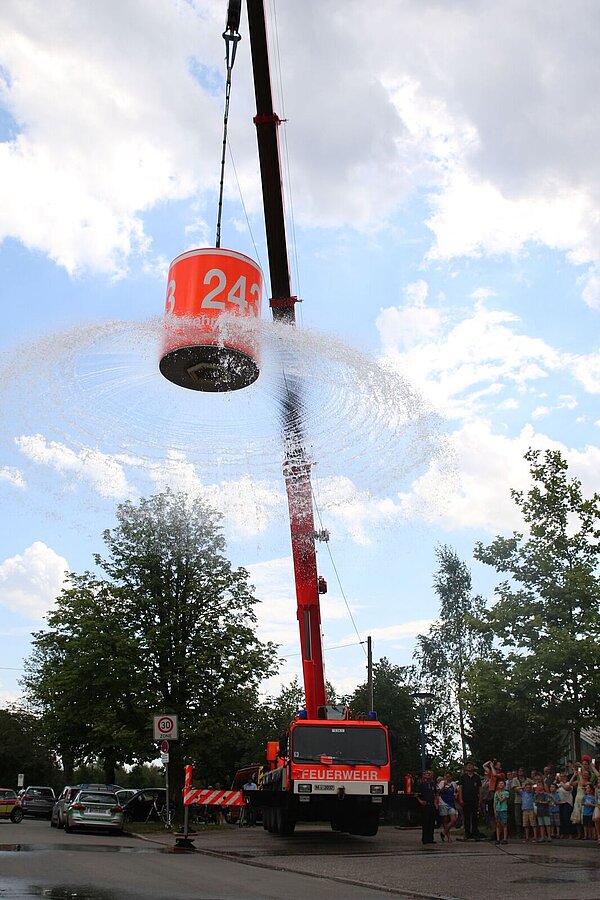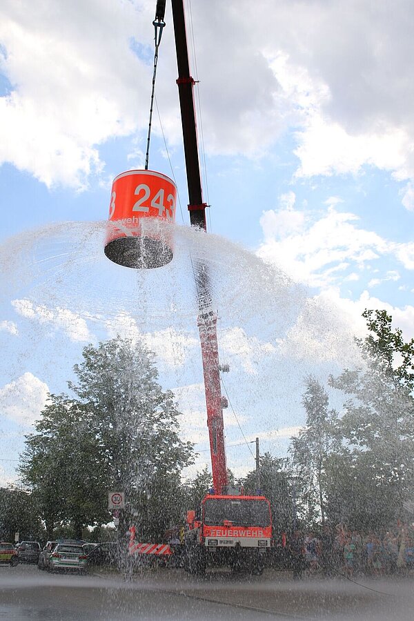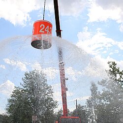 Mit 5000 Litern Fassungsvermögen können diese im Einsatz nur von einem großen Transporthubschrauber der Bundeswehr, CH-53, oder wie hier zu Vorführzwecken mit einem Kran gehoben werden. Aus Sicherheitsgründen durfte natürlich niemand direkt darunter stehen, dennoch sorgte das Ablassen des Löschwassers für eine angenehme Erfrischung.