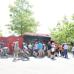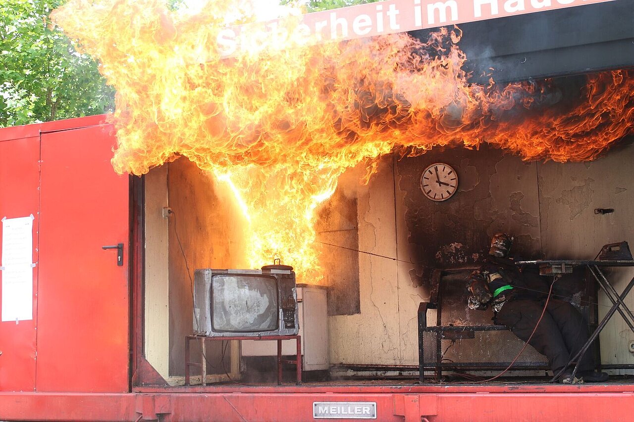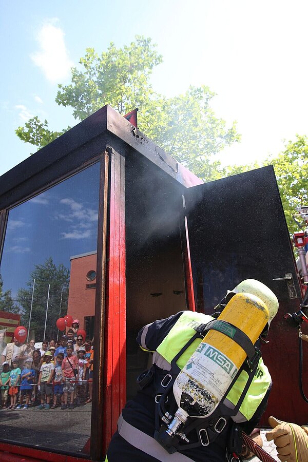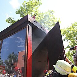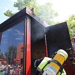 In der Kinder-Erlebniswelt kamen die kleinen Besucher voll auf ihre Kosten. Bei Hüpfburg, Schubkarrenrennen, Spritzwand und vor allem der Atemschutzübungsstrecke der Berufsfeuerwehr (MOBAS) amüsierte sich der künftige Jugendfeurwehrnachwuchs prächtig, während sich die Erwachsenen über alle technischen Details des HLF erkundigen konnten.