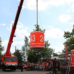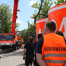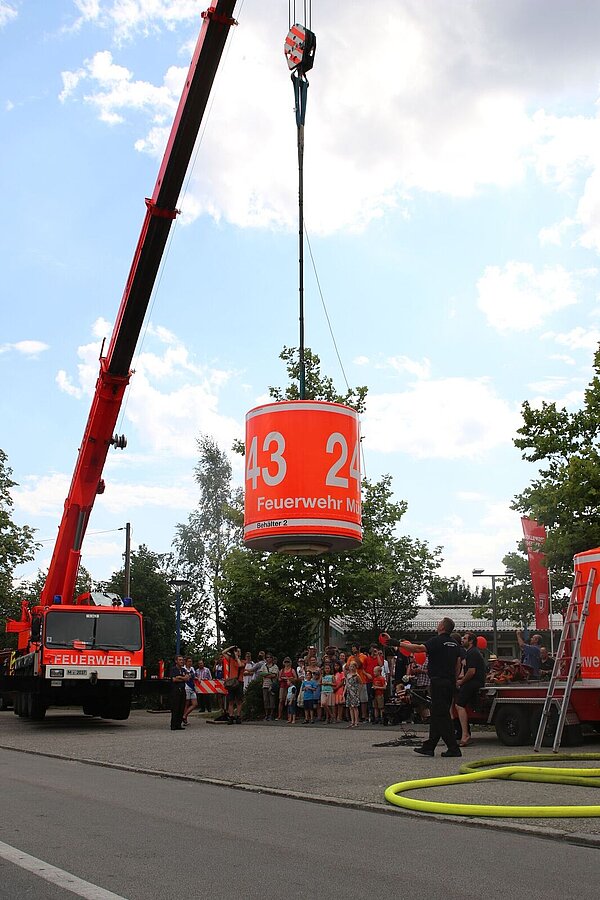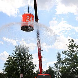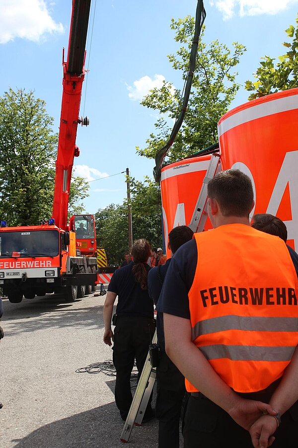 Gegen Nachmittag gab es dann die erste Erfrischung nach diesem sehr warmen Vormittag. Der Kran der Feuerwache 9 traf ein und hob die großen Löschwasseraußenlastbehälter Semat 5000 in die Höhe. Diese dienen zur Wald- und Flächenbrandbekämpfung per Hubschrauber.