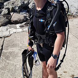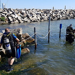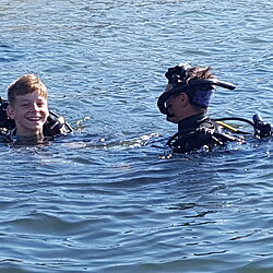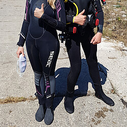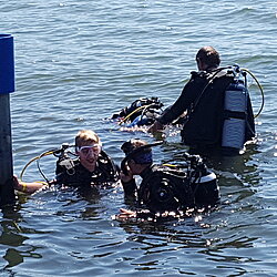 Am Dienstag stand für viele Mitglieder unserer Gruppe das persönliche Highlight der Rügenfahrt auf dem Programm. Es ging zum Schnuppertauchen! Die Tauchschule „Baltic Sea-Dive Rügen“ war gleich mit 4 Mann angerückt, um allen, die Lust hatten, den Tauchsport näher zu bringen. Zunächst gaben uns unsere Tauchlehrer Robert und Wolfgang eine Einweisung in den Umgang mit der Tauchausrüstung. Anschließend wurden die Teilnehmer nach und nach eingekleidet und ins Wasser geschickt, wo bereits die Tauchlehrer auf uns warteten. Jeder durfte (begleitet von seinem persönlichen Tauchlehrer) 15-20 Minuten lang in 1-2 Meter Tiefe umhertauchen und Seenadeln, Barsche, Flundern, Grundeln, Quallen und Putzergarnelen in ihrem natürlichen Lebensraum beobachten. An dieser Stelle nochmals ein ganz großes Dankeschön an unsere Tauchlehrer, die sich nicht nur viel Zeit für jeden einzelnen genommen haben, sondern uns auch noch ein tolles Unterwasser-Video gemacht haben!