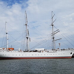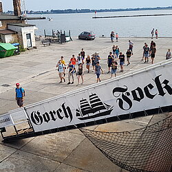 Nach einem ersten Tag mit körperlich sehr anstrengendem Programm gab es am zweiten Tag mal ein wenig geistige Bildung. Wir fuhren mit der Regionalbahn aufs Festland nach Stralsund. Dort bekamen wir vormittags eine Führung über die „Gorch Fock I“. Nachmittags ging es dann ins „Ozeaneum“. Eine Mischung aus Meeres-Museum und Aquarium. Besonderes Highlight für die Kleinen war hier das Pinguin-Gehege auf dem Dach. Die Großen genossen derweil die Liegestühle im angenehm klimatisierten und dunklen Inneren des Museums. Bei Walgesängen kann man hier ein herrliches Mittagsschläfchen halten!