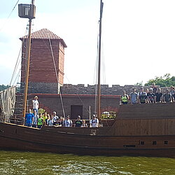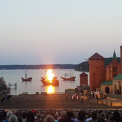 Nachmittags ging es dann nach Ralswiek zu den „Störtebeker Festspielen“. Mit mehr als 8.000 Sitzplätzen die größte Freilichtbühne Deutschlands. In den Sommermonaten werden dort rund 70 x die Abenteuer des Piraten „Klaus Störtebeker“ erzählt, der im Mittelalter als „Robin Hood der Meere“ die Ost- und Westsee (heutzutage als „Nordseee“ bezeichnet) unsicher gemacht hat. Zunächst bekamen wir eine Backstage-Führung durch die Kulissen und die Stallungen. Danach schauten wir uns noch die Piraten-Schiffe und die Vorbereitungen des Abschluss-Feuerwerks an.