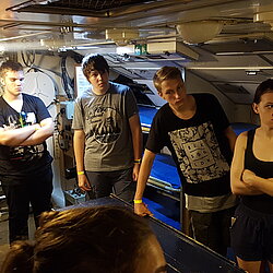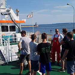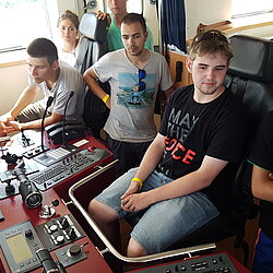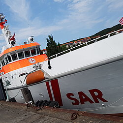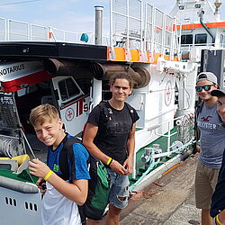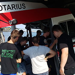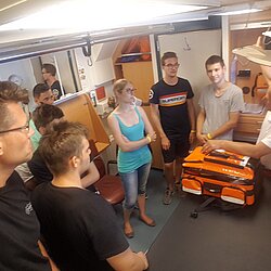 Nachmittags bekamen wir dann noch eine Führung durch die „Harro Koepke“, mit über 36 Metern Länge einer der größten Seenotrettungskreuzer Deutschlands. Fünf hauptamtliche Mitarbeiter haben 14 Tage lang am Stück rund um die Uhr Dienst auf dem Schiff und können innerhalb weniger Minuten auslaufen, wenn irgendwo in der Ostsee ein Schiff in Seenot gerät. Besonders beeindruckend fanden wir, dass das Schiff darauf ausgelegt ist im Notfall bei schwerer See eine komplette „Fassrolle“ unbeschadet zu überstehen. Alles an Bord, vom Bild an der Wand bis zum Beiboot, ist dementsprechend gesichert. Mit 6.500 PS erreicht das 30 Millionen teure Rettungsschiff eine Höchstgeschwindigkeit von 25 Knoten (ca. 46 km/h) und kann mit seinen 45 Tonnen Treibstoff ca. 900 Seemeilen (knapp 1.700 km) weit fahren. Auch die Ausstattung ist beeindruckend. Neben den Unterkunftsräumen der Mannschaft gibt es noch ein Beiboot, dass „Huckepack“ mitgeführt wird, einen Hubschrauber-Landeplatz, Leinenwurf-Harpunen, Schlepphaken um große Schiffe wegzuziehen, Feuerlöschgerätschaften aller Art, Wasserwerfer mit bis zu 110 Metern Reichweite, Ölsperren und eine Krankenstation. Auf die Frage unseres Rettungsassistenten hin, ob man denn bei 6 Meter Wellen seinen Patienten noch einen Zugang legen kann, bekamen wir die lapidare Antwort: „Gibt ne ziemliche Sauerei bis man mal getroffen hat, aber geht schon!“. :o)