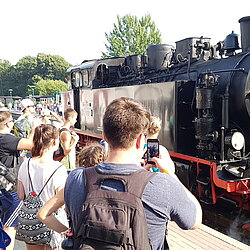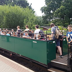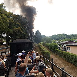 Morgens ging es mit den Fahrrädern nach Binz zum Bahnhof. Dort bestiegen wir den „rasenden Roland“. Diese historische Schmalspur-Bahn mit Dampflokomotive war früher eines der wichtigsten Transportmittel auf der Insel. Heute ist sie eher eine Touristenattraktion. Es gibt sogar einen Cabrio- Wagen, der von unseren Kids natürlich sogleich erobert wurde.