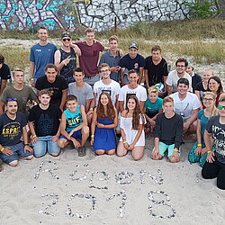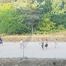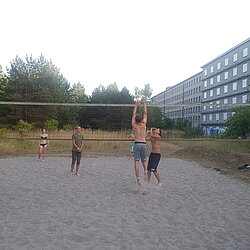 Es folgte das Beziehen der Zimmer und ein erstes Bad in der Ostsee. Erfreulicherweise hatten wir noch fünf Mehrbett-Zimmer in Deutschlands einziger Jugendherberge mit eigenem Privatstrand bekommen. Somit waren es keine 50 Meter Fußweg bis wir die Füße in den Sand stecken konnten. Ein Fußballplatz, ein Basketballfeld und ein Beach-Volleyballplatz gab es ebenfalls.