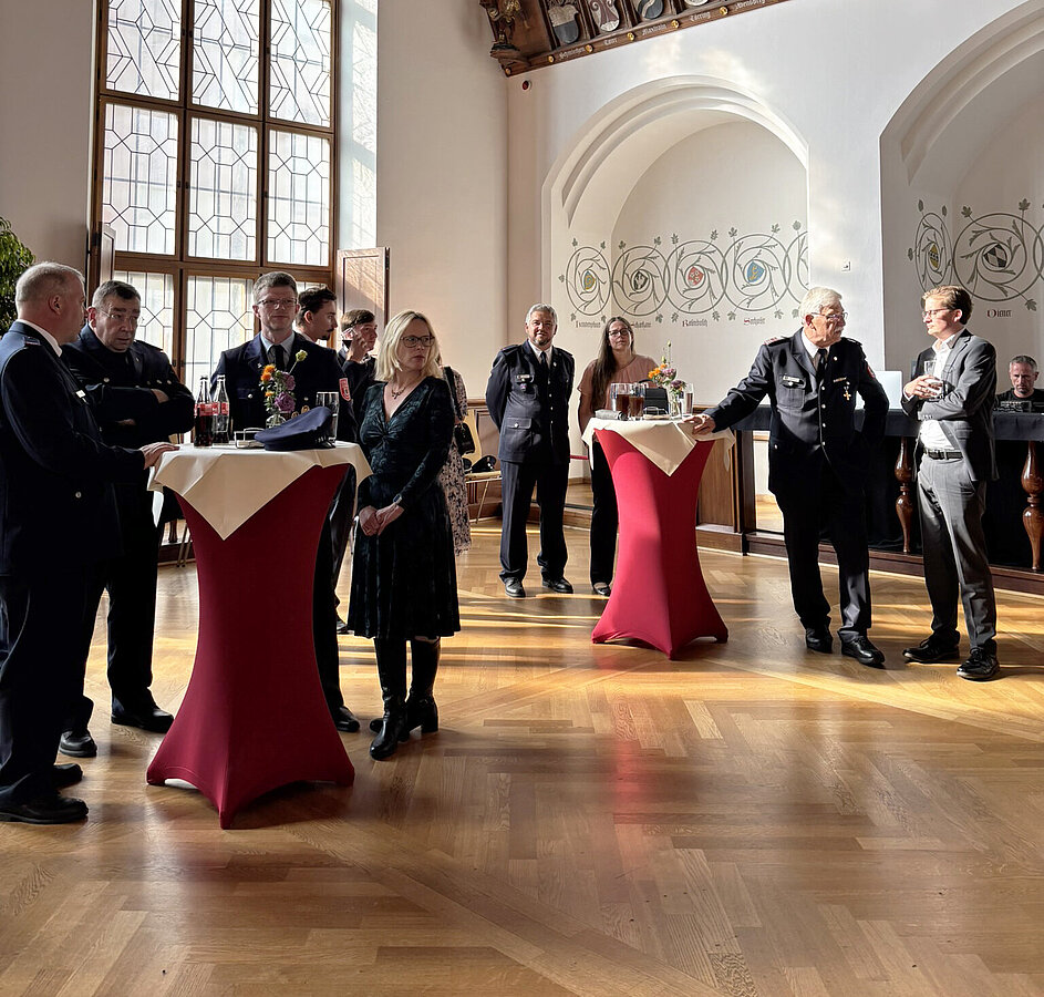 Nach der Ehrungszeremonie lud Stadtbrandrat Claudius Blank zu einem Stehempfang ein. Diese Gelegenheit nutzten die Anwesenden, um sich über vergangene Einsätze, zukünftige Herausforderungen sowie die gemeinsame Arbeit in der Feuerwehr auszutauschen.