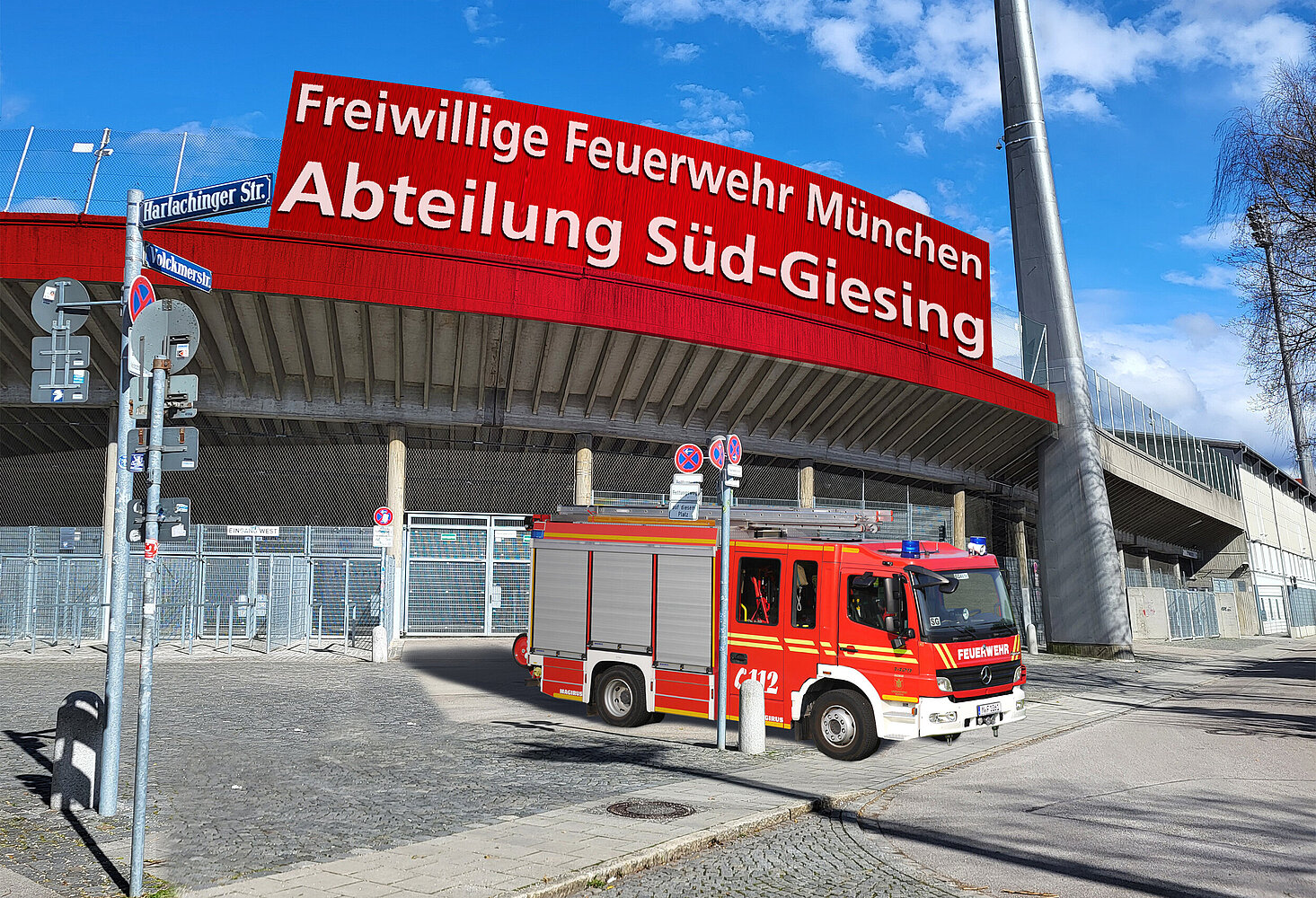 Die Standortwahl fiel auf das Städtische Stadion an der Grünwalder Straße, im Volksmund kurz Sechzgerstadion genannt. Die Voraussetzungen wären ideal gewesen, so Stadtbrandrat und Kommandant der FF München Claudius Blank. „Die Verkehrsanbindung ist optimal, das Ausrückgebiet ergänzt die bestehenden Gerätehausstandorte sehr gut und das Stadion war bereits in städtischer Hand“ so Blank weiter.