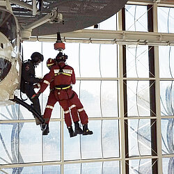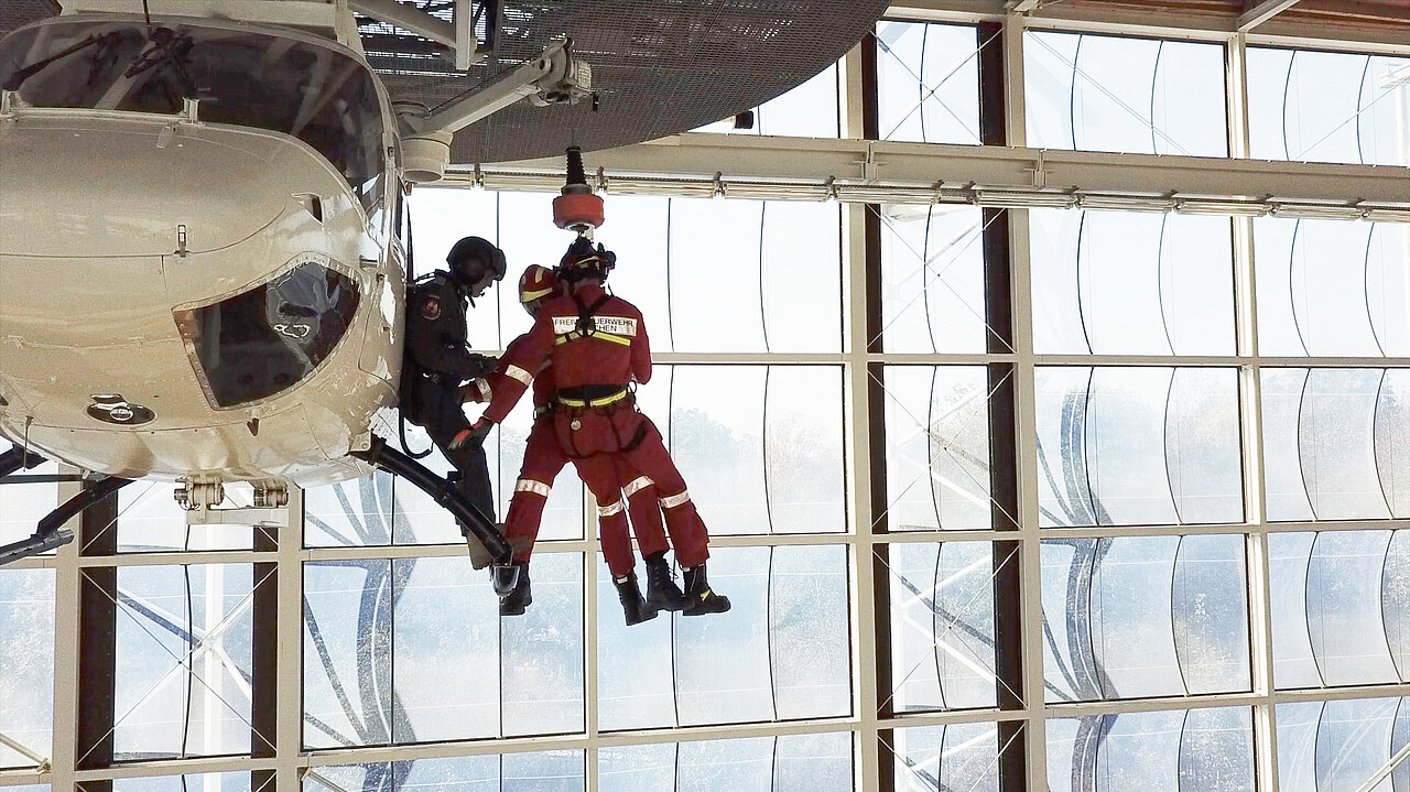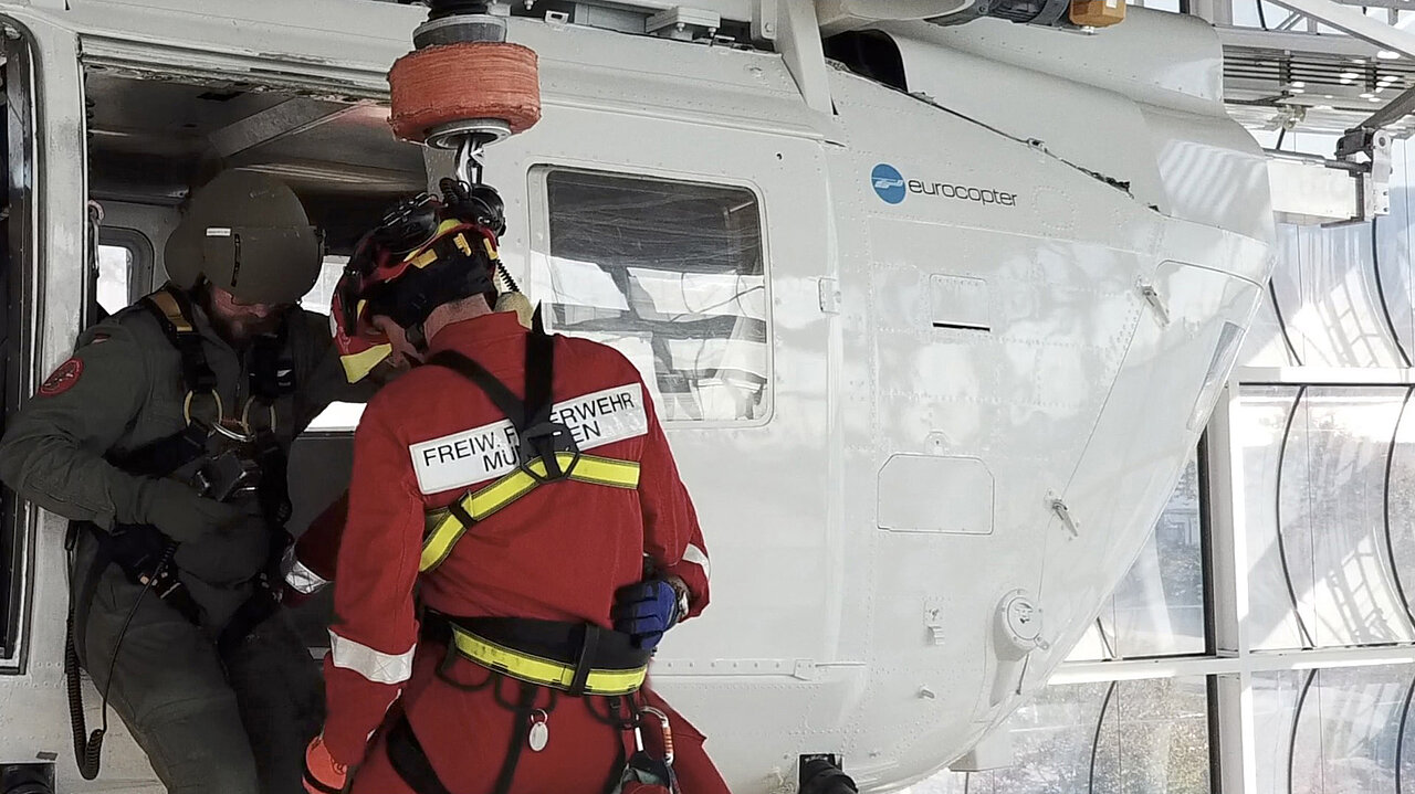 In der gigantischen Halle des ZSA befinden sich an der Decke zwei ausgediente Hubschrauberzellen, die mit einer Personenwinde wie ihre realen Geschwister ausgestattet sind. Gemeinsam mit der Staatlichen Feuerwehrschule Würzburg (SFS-W) üben die Münchner Flughelfer an verschiedenen Stationen das Ab- und Aufwinchen entweder alleine oder zu zweit (Doppelwinch).