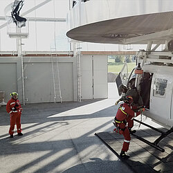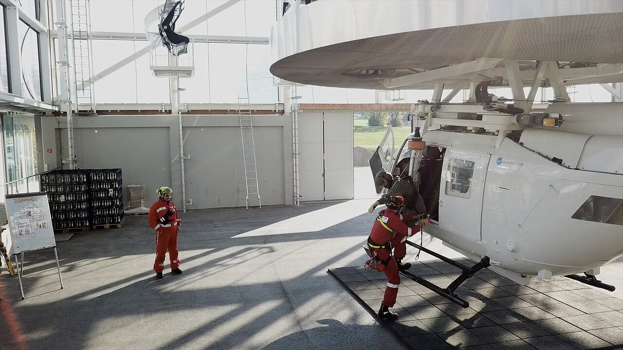Was für Piloten der Flugsimulator bedeutet, nämlich gefahrloses Üben ohne Lärm- und Abgasemmissionen, das bedeutet im ZSA für die Flughelfer ein ebenfalls geräuschloses und witterungsfreies Üben der Windenvorgänge, so wie sie im realen Einsatz vorkommen oder im Sommer mit echten Hubschraubern geübt werden.