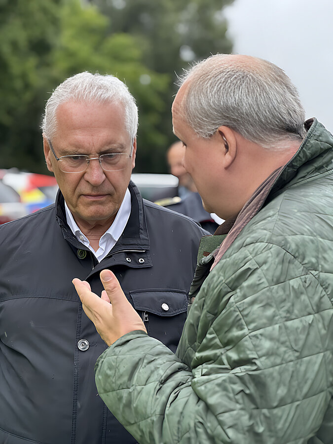 Joachim Herrmann, Bayerischer Staatsminister des Innern sowie Landrat Christoph Göbel machten sich ein Bild vor Ort bei der Einsatzlage in Aschheim. Innenminister Herrmann zeigte sich beeindruckt von der Organisation und der Professionalität der Einsatzkräfte: „Regelmäßige organisationsübergreifende Übungen sind für den Zivil- und Katastrophenschutz gleichermaßen wichtig. Dabei können die Einsatzkräfte der Hilfs- und Rettungsorganisationen verschiedenste Lagen trainieren und nachbereiten und ihre enge Zusammenarbeit weiter ausbauen.“
