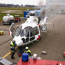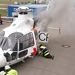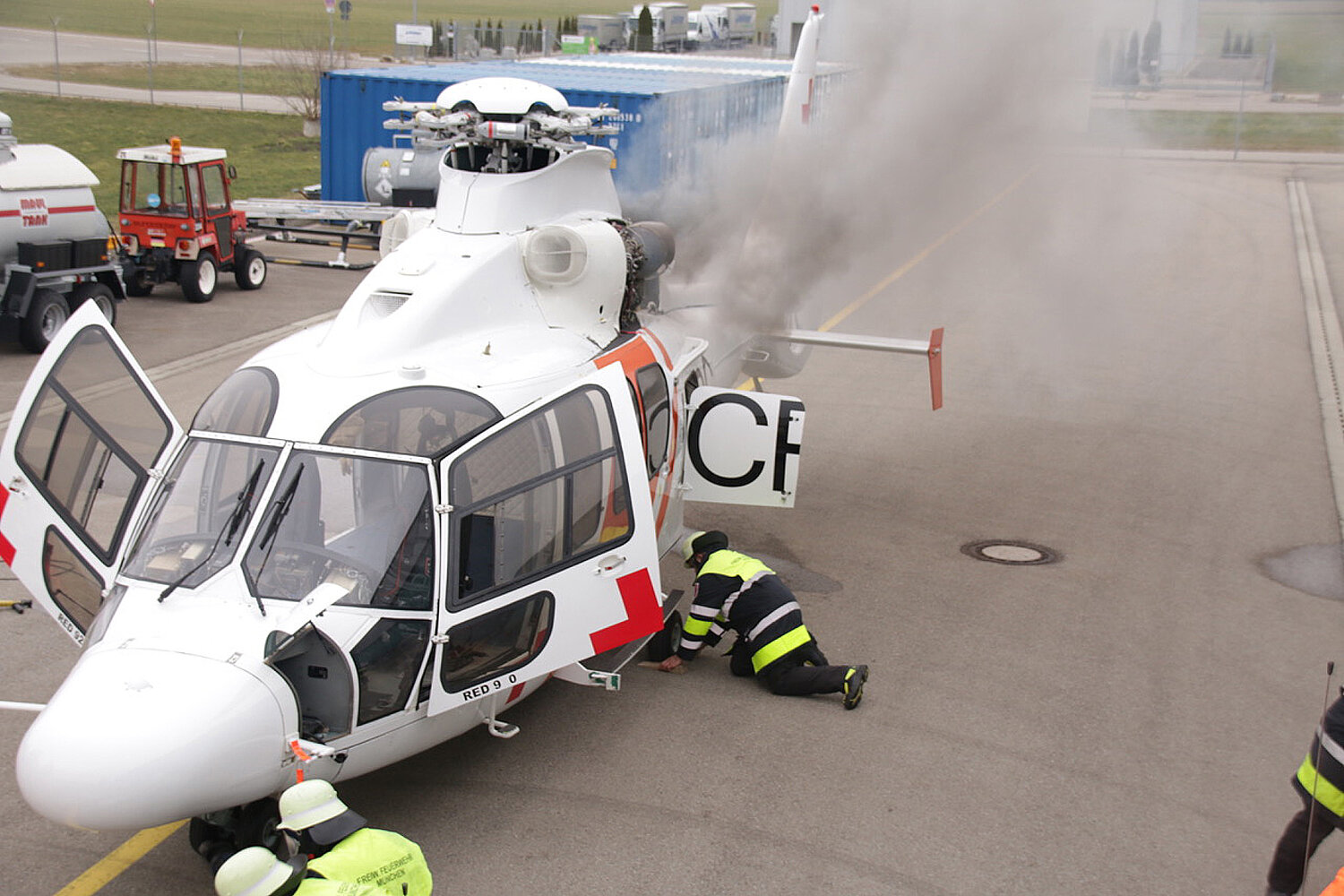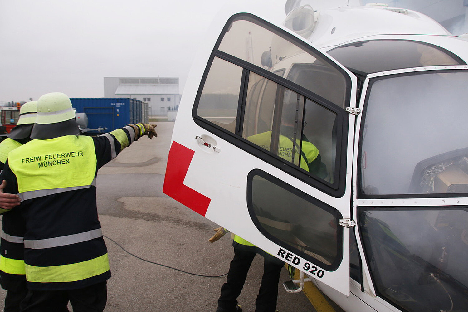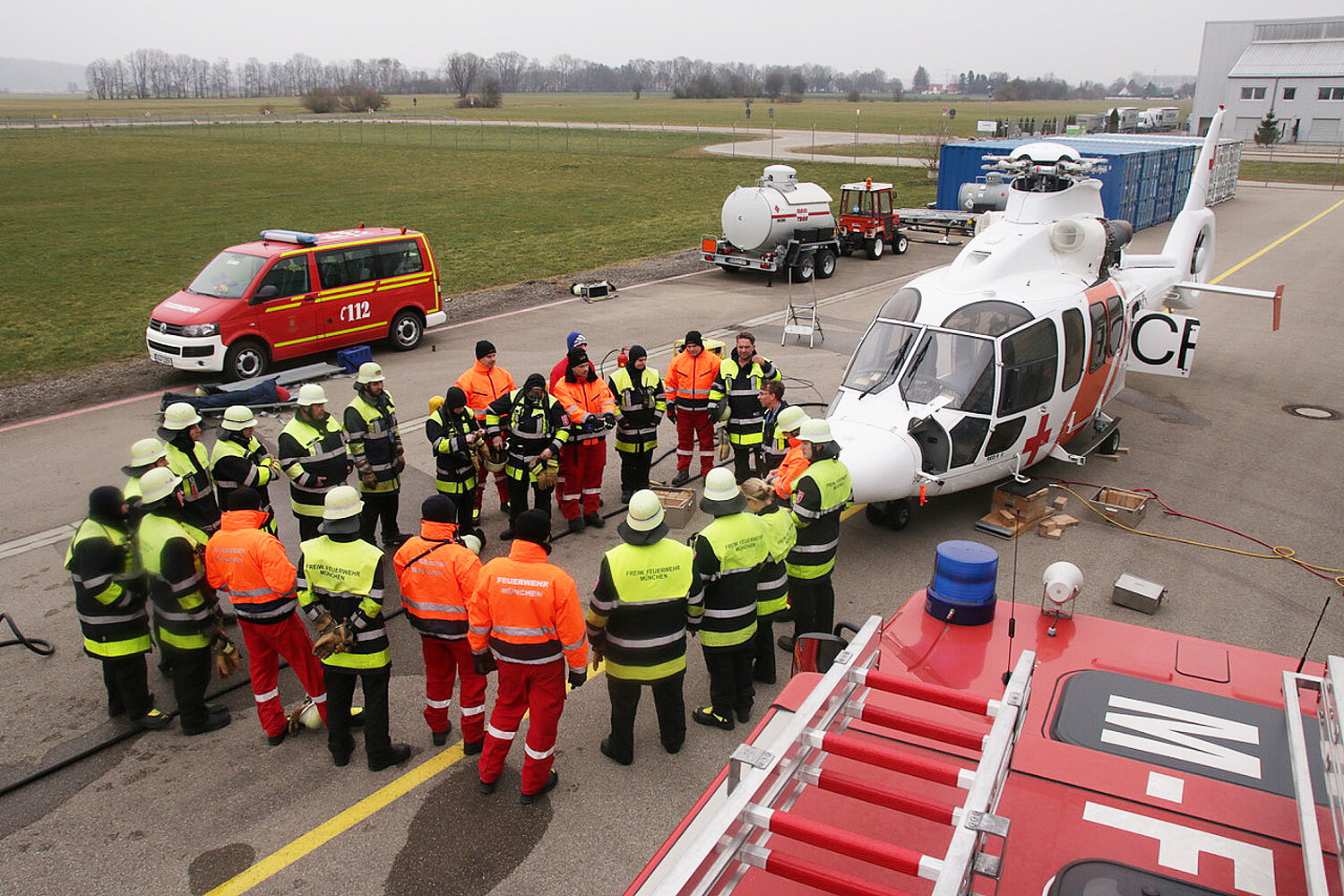Am Augsburger Flughafen übten 25 Ehrenamtliche der FF München den Einsatz bei technischen Problemen und Unfällen mit Hubschraubern.