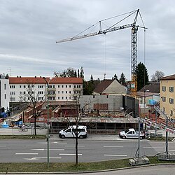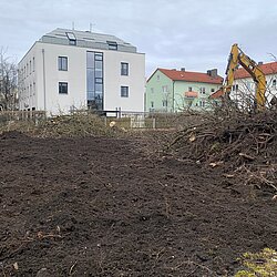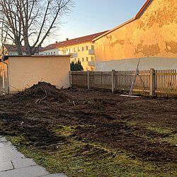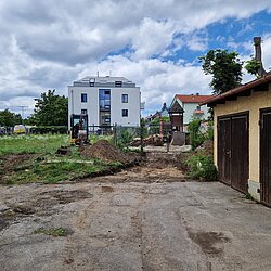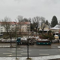 Der Neubau ist auf dem Grundstück direkt westlich davon gelegen vorgesehen (im Lageplan gelb). Es wird ein dreigeschossiger Flachbau mit drei Fahrzeuggassen und Tiefgarage errichtet. Siehe dazu den Beschluss vom Mai 2022.
