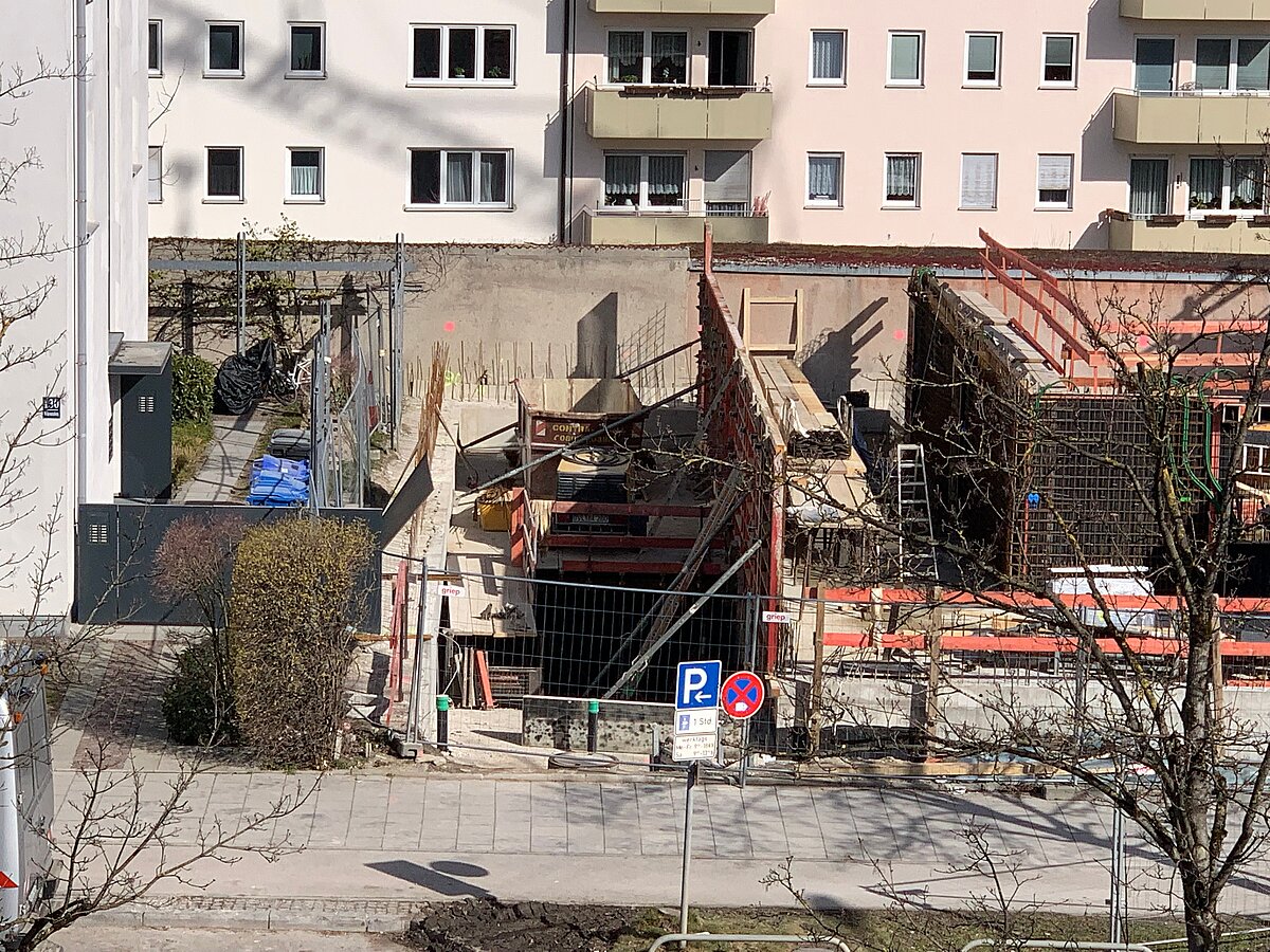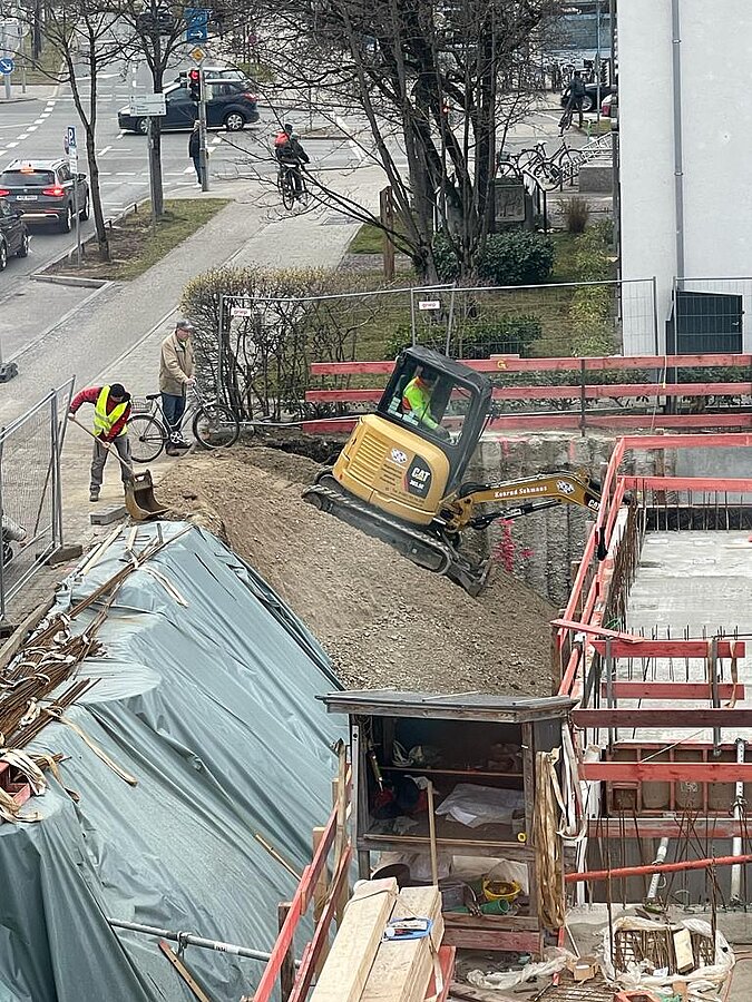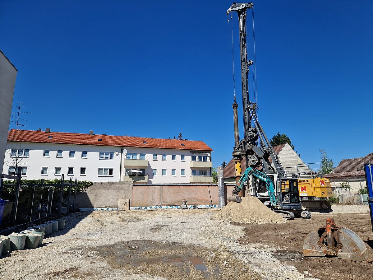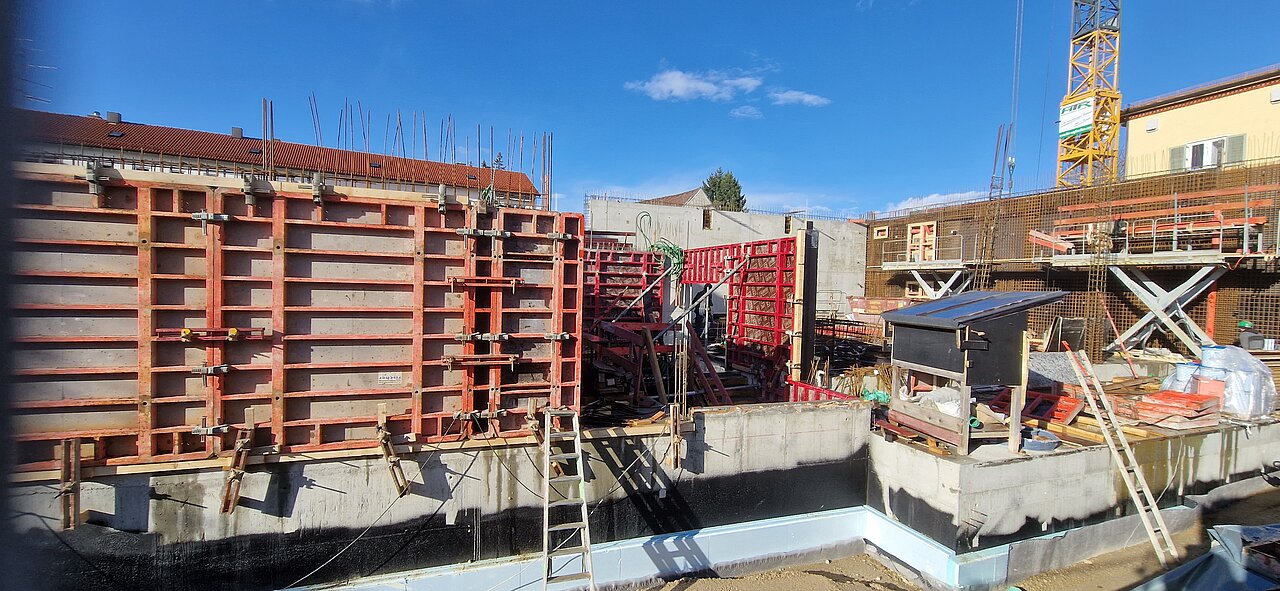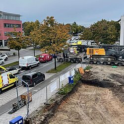 Im Herbst letzten Jahres waren die vorbereitenden abgeschlossen und der Aushub der Baugrube konnte beginnen. Hierfür mussten die Wände der Baugrube gesichert werden. Dies geschah mit sogenannten Bohrpfahlwänden, bestehend aus insgesamt 1.000 Meter Bohrpfählen. Für alle weiteren Bauarbeiten musste danach zunächst mithilfe eines Kranfahrzeuges ein Turmdrehkran aufgebaut werden.