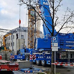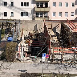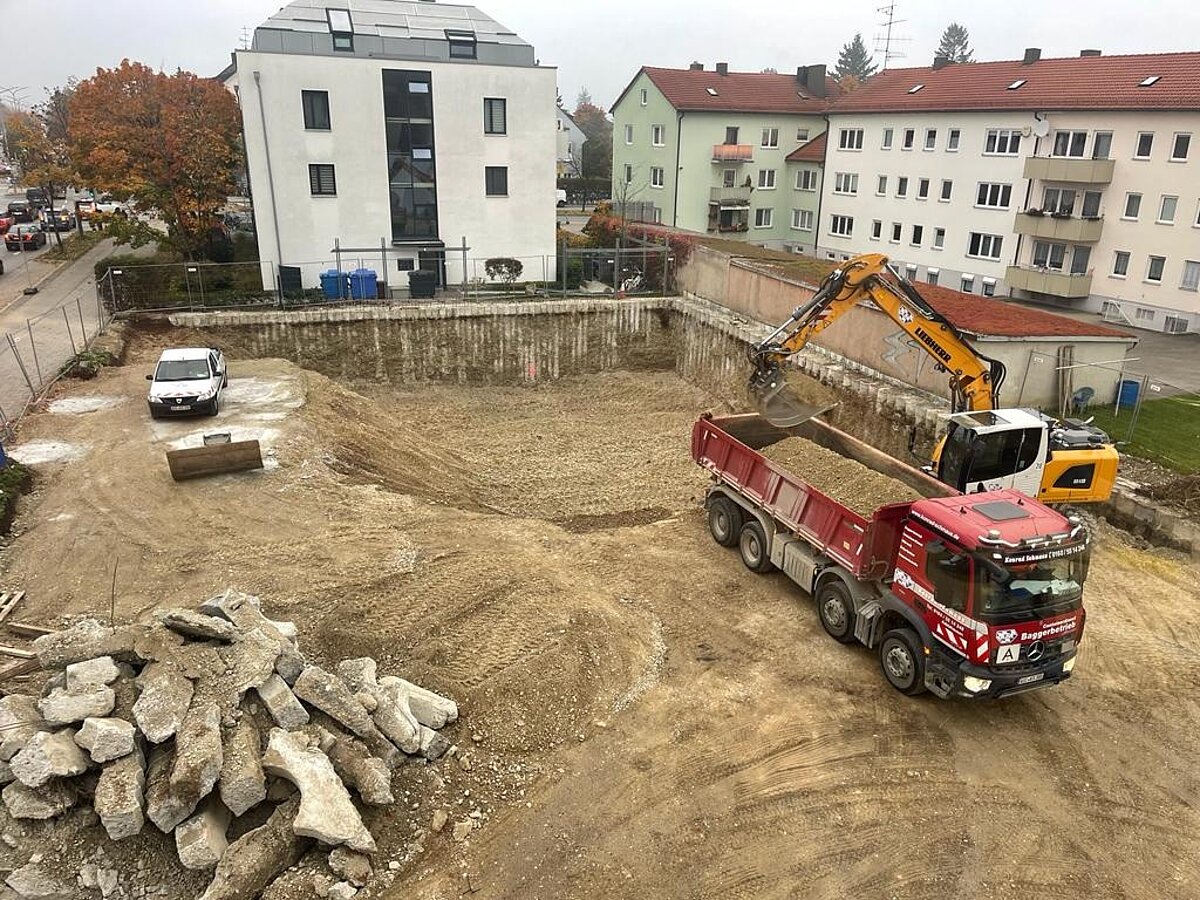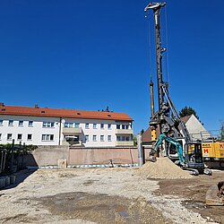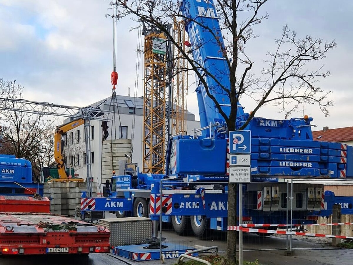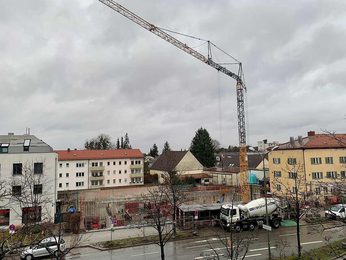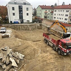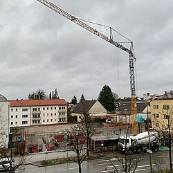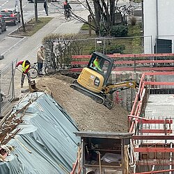 Im Herbst letzten Jahres waren die vorbereitenden abgeschlossen und der Aushub der Baugrube konnte beginnen. Hierfür mussten die Wände der Baugrube gesichert werden. Dies geschah mit sogenannten Bohrpfahlwänden, bestehend aus insgesamt 1.000 Meter Bohrpfählen. Für alle weiteren Bauarbeiten musste danach zunächst mithilfe eines Kranfahrzeuges ein Turmdrehkran aufgebaut werden.