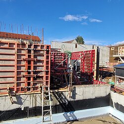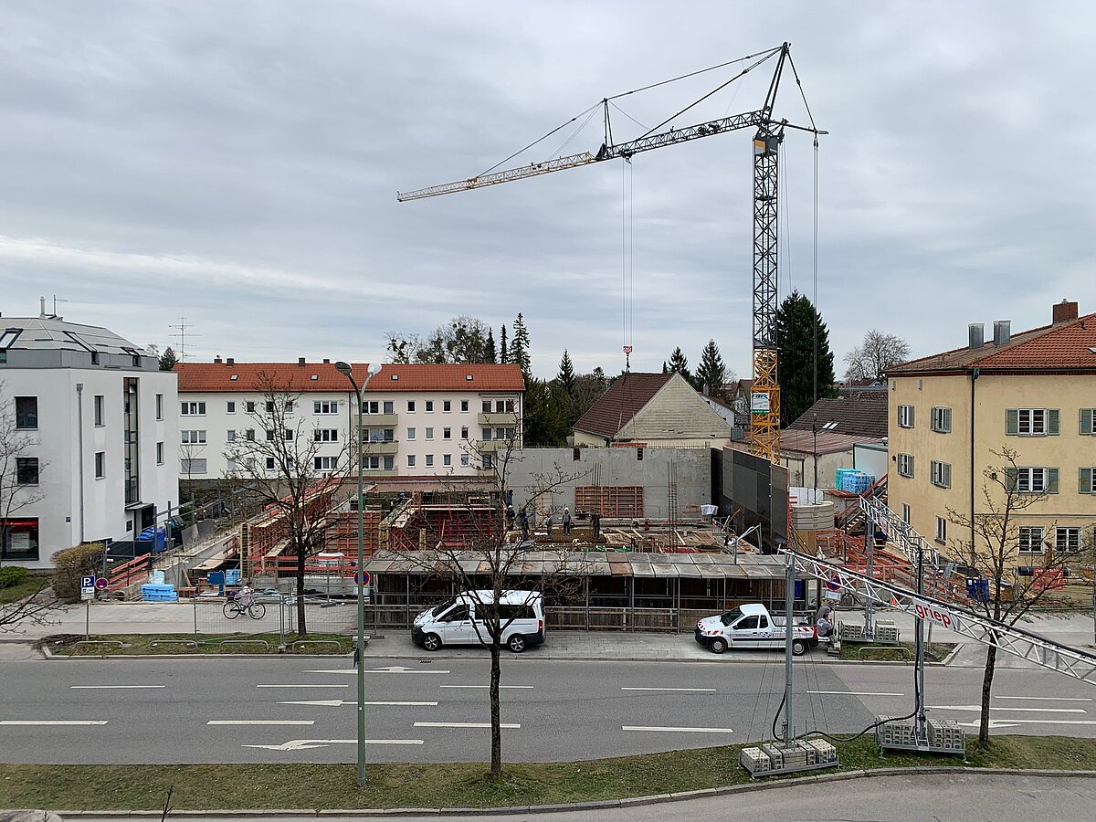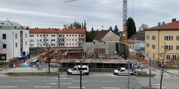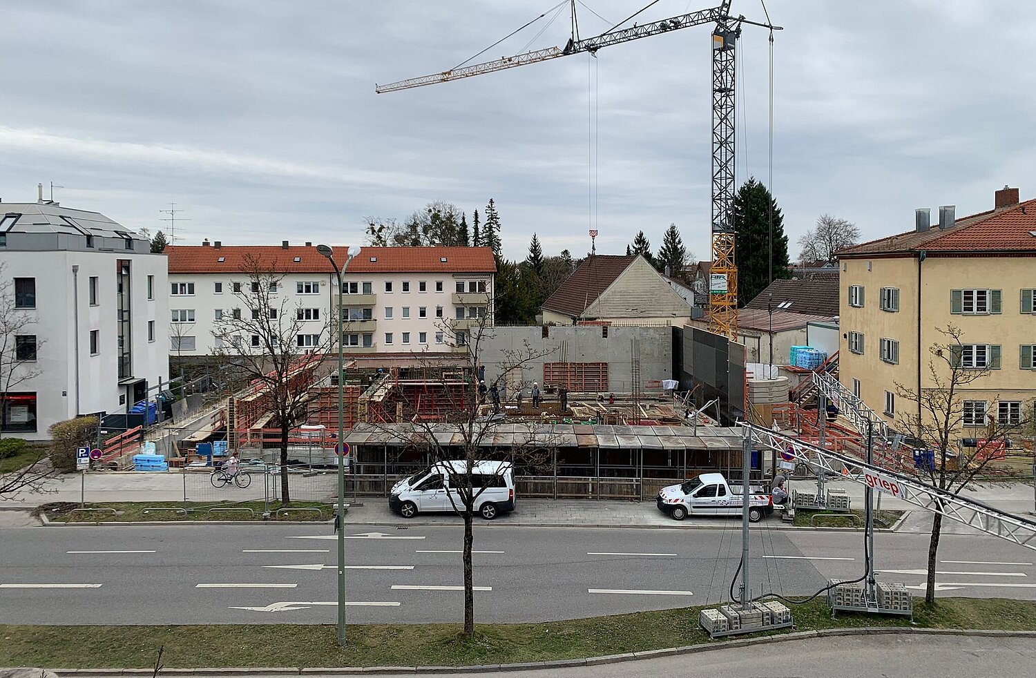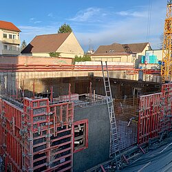 Im Dezember 2022 wurde die Bodenplatte fertiggestellt, sodass Anfang Januar 2023 die Schalplatten für die Wände des Kellers gesetzt, mit Stahl bewehrt und gegossen werden konnten. Im März 2023 war bereits die Kellerdecke fertiggestellt und Ende April war bereits das Erdgeschoß im Rohbau zu erkennen.