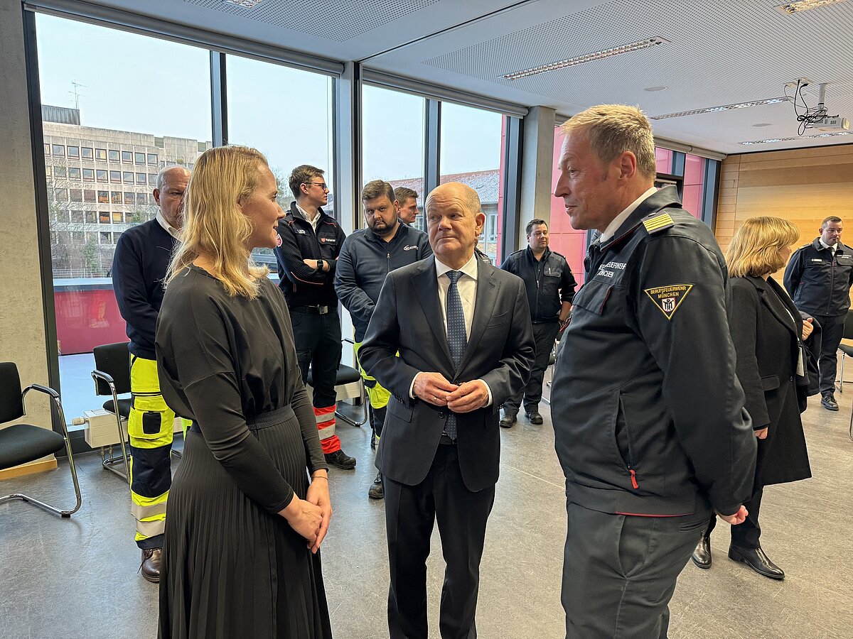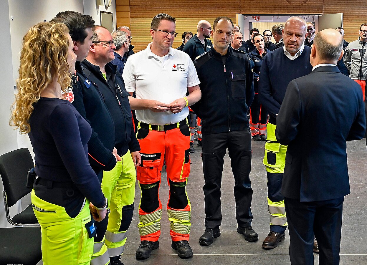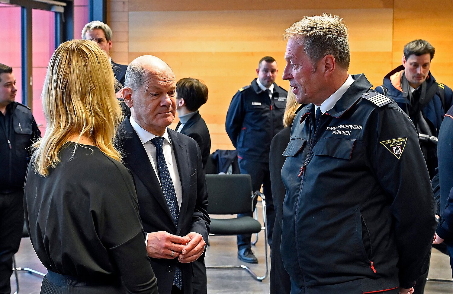 Bundeskanzler Olaf Scholz hat am Samstag, den 15. Februar Einsatzkräfte getroffen, die am 13. Februar in der Seidlstraße im Einsatz waren.