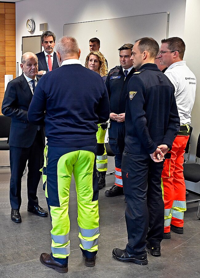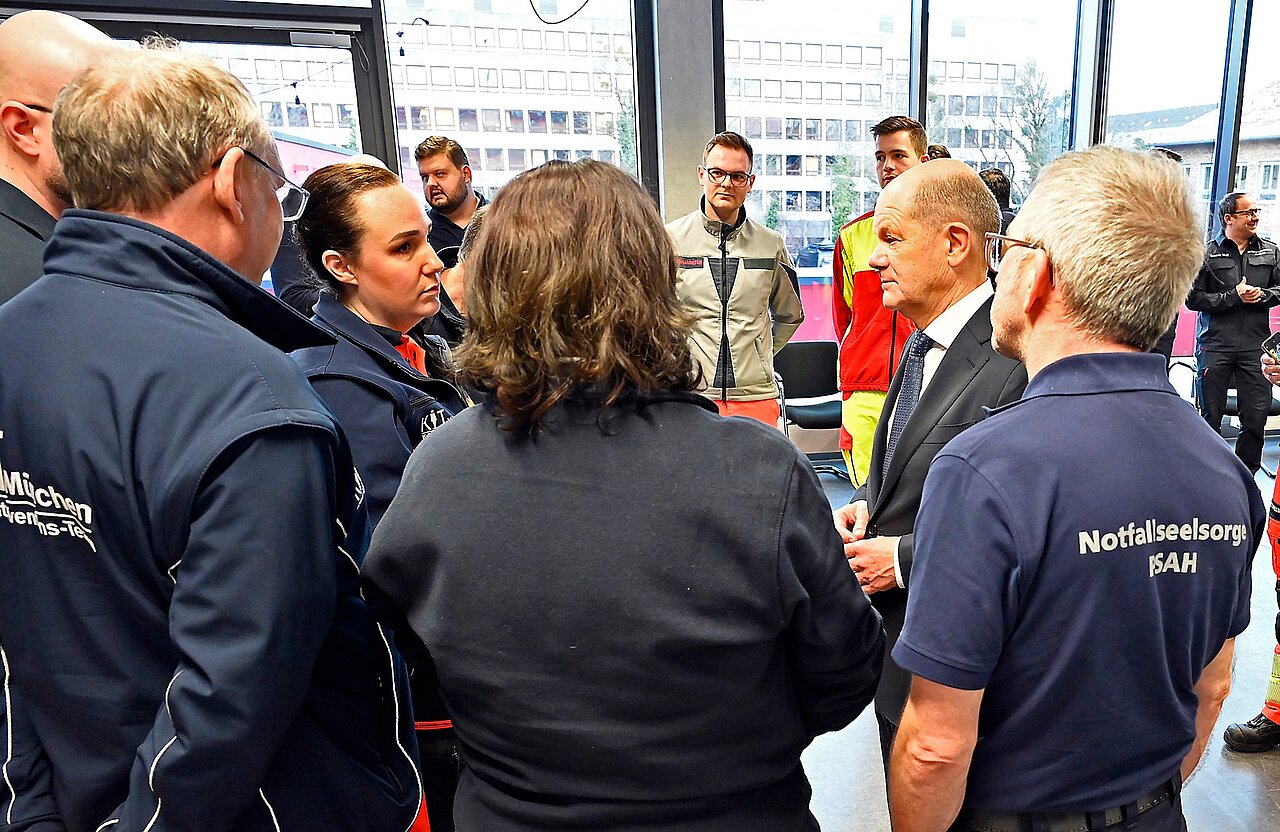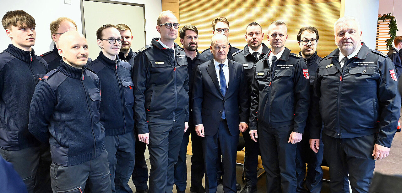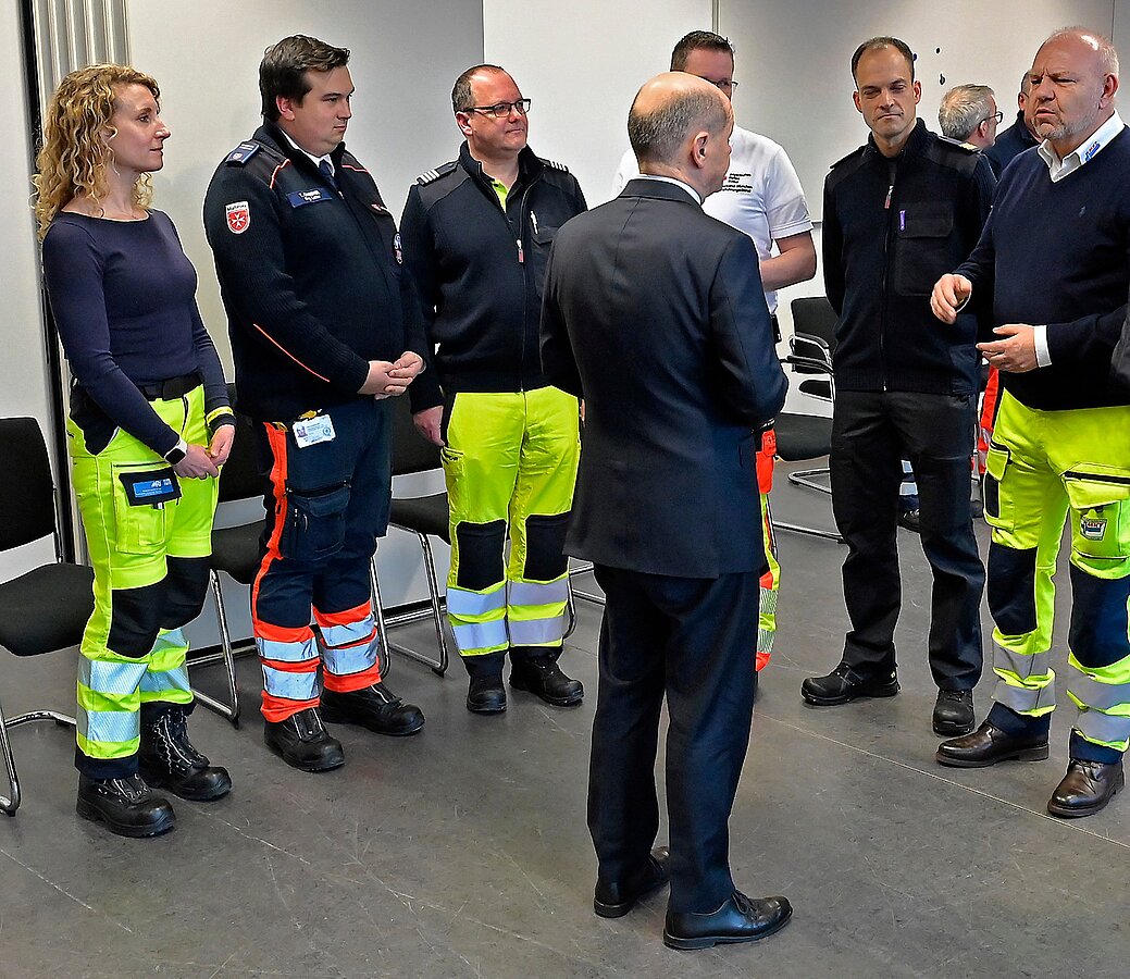 Bundeskanzler Olaf Scholz hat am Samstag, den 15. Februar Einsatzkräfte getroffen, die am 13. Februar in der Seidlstraße im Einsatz waren.