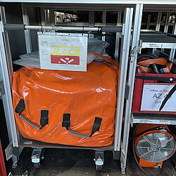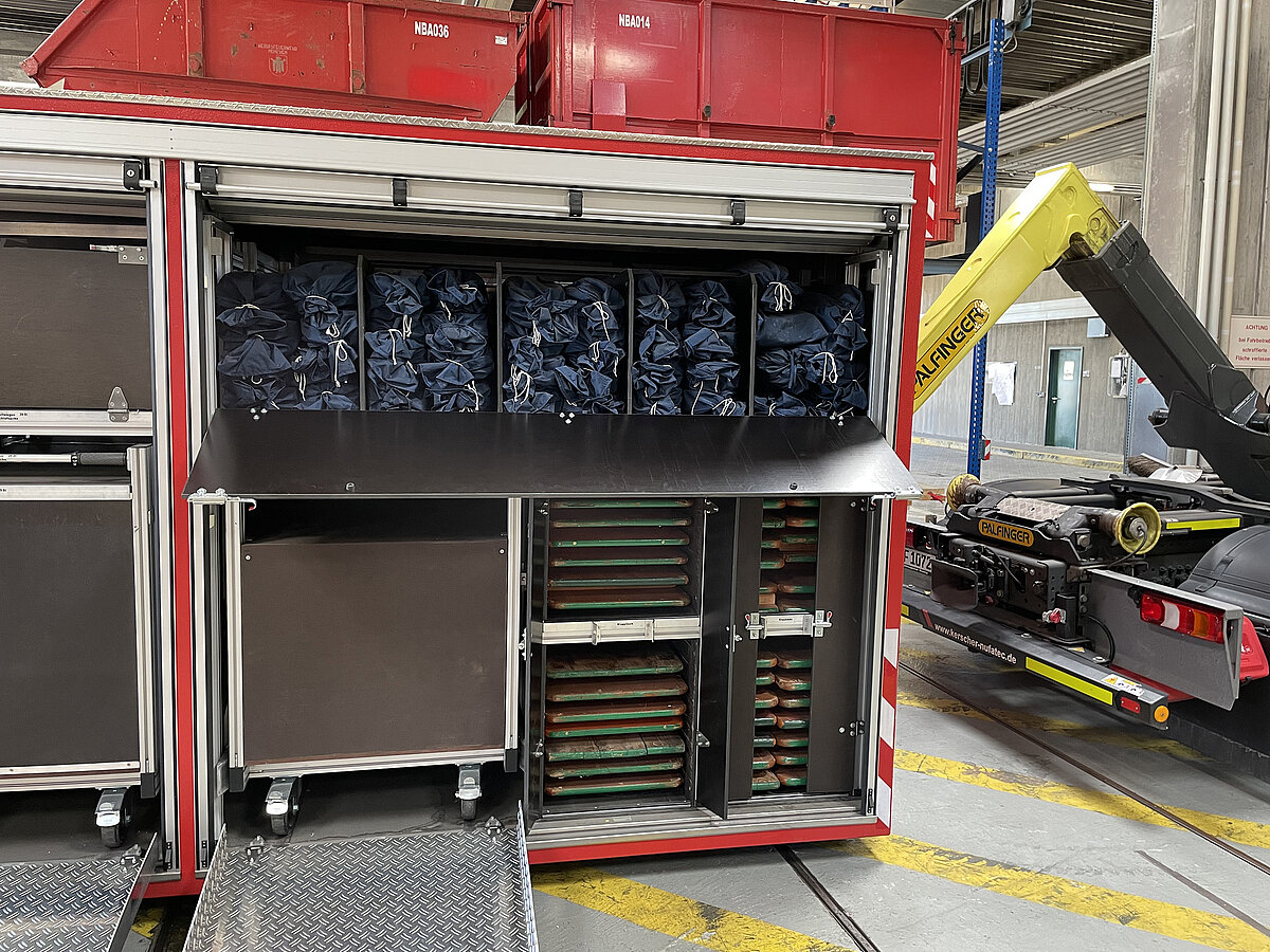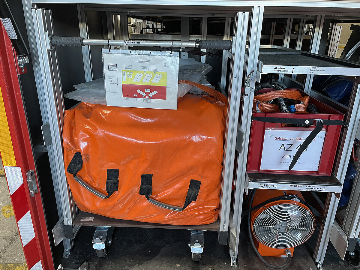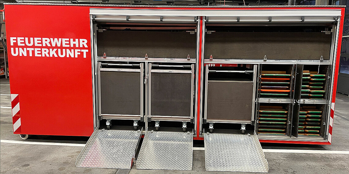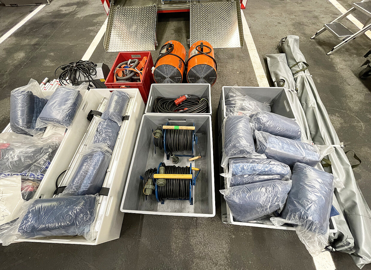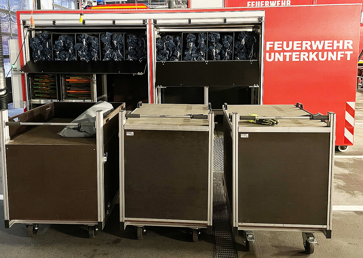 Der Abrollbehälter Unterkunft verfügt über eine Ausstattung, um eine vorübergehende Unterkunft für Betroffene oder Einsatzkräfte in einer Halle oder im Freien aufzubauen.