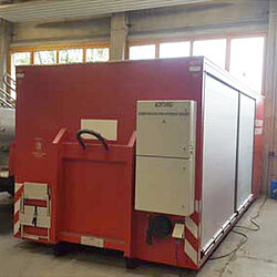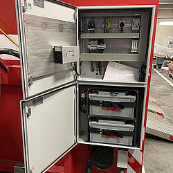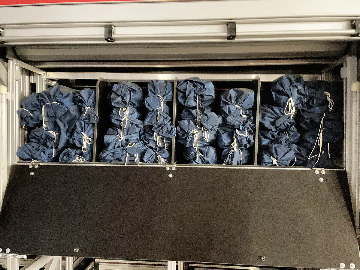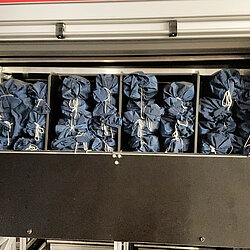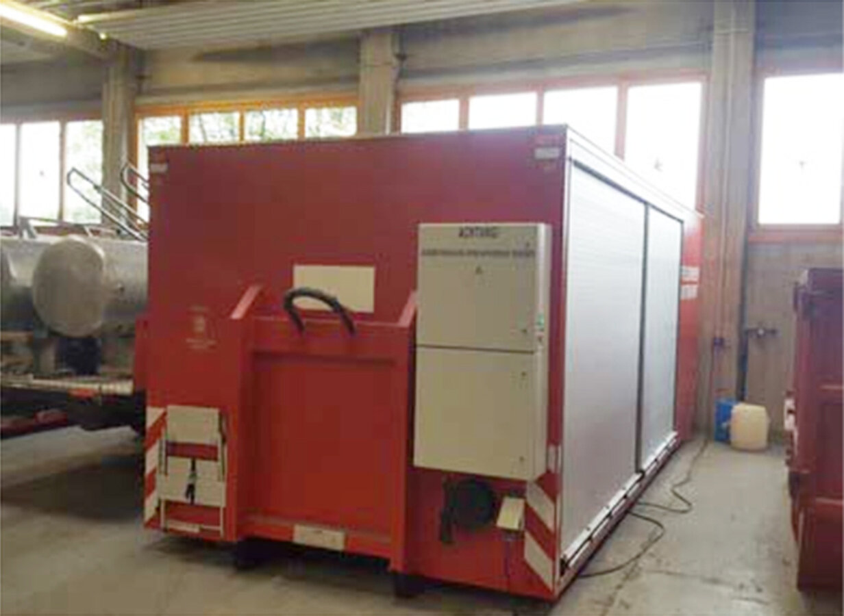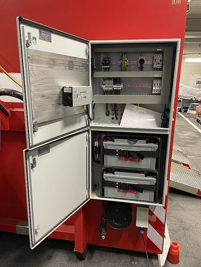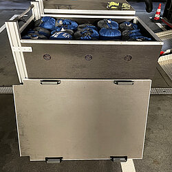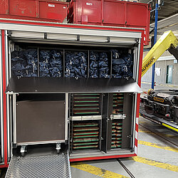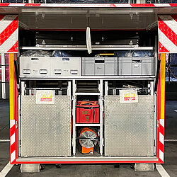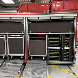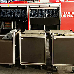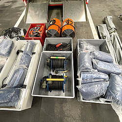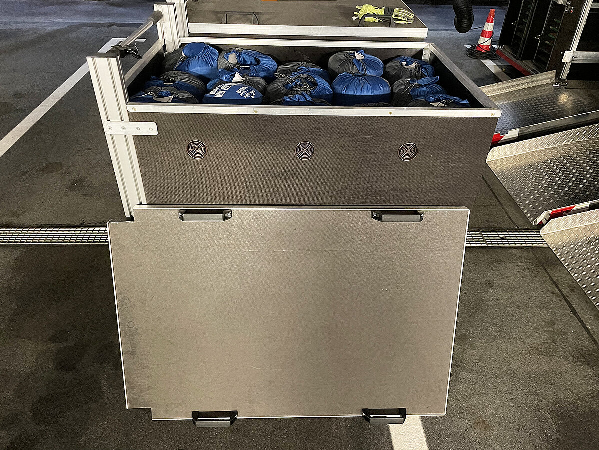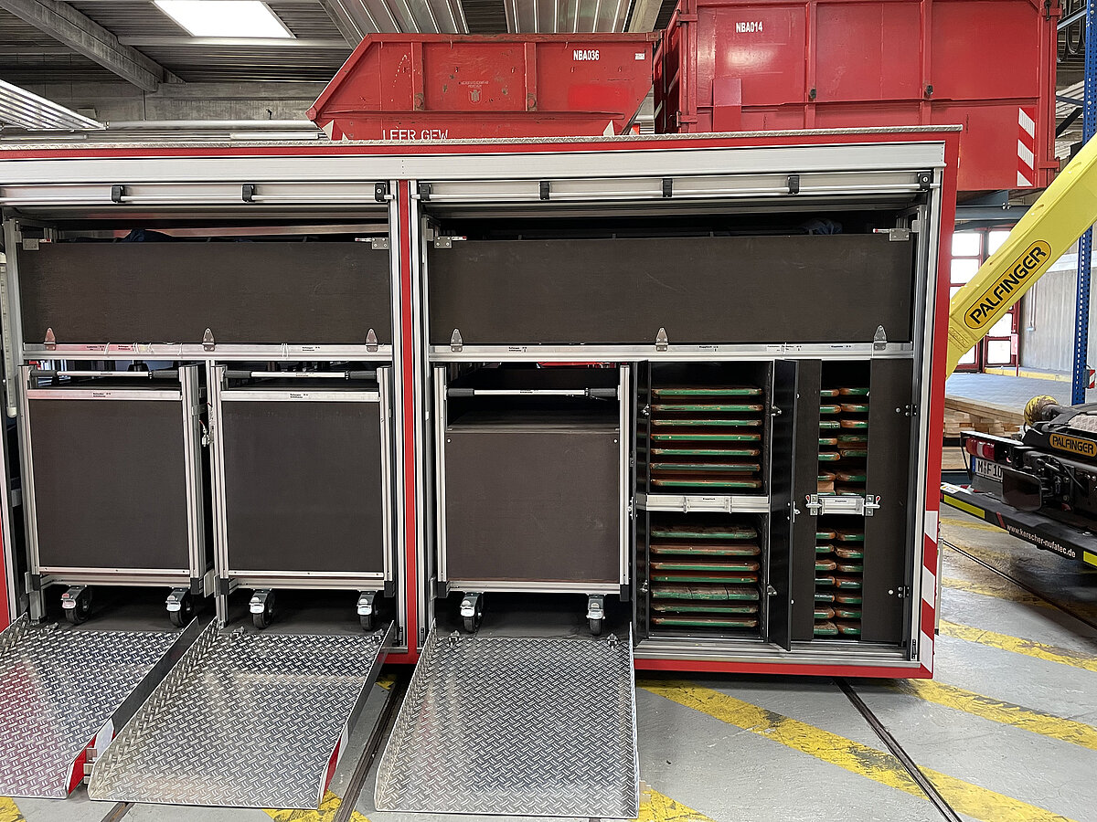 Der Abrollbehälter Unterkunft verfügt über eine Ausstattung, um eine vorübergehende Unterkunft für Betroffene oder Einsatzkräfte in einer Halle oder im Freien aufzubauen.