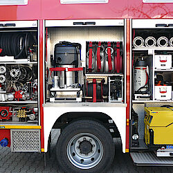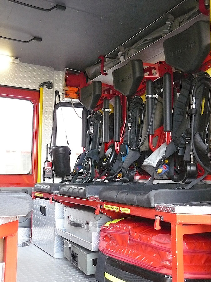 Für Brandeinsätze ist das Fahrzeug mit fünf Pressluftatmern ausgestattet. Im Mannschaftsraum können bereits während der Anfahrt zur Einsatzstelle drei umluftunabhängige Atemschutzgeräte aufgenommen werden.
