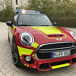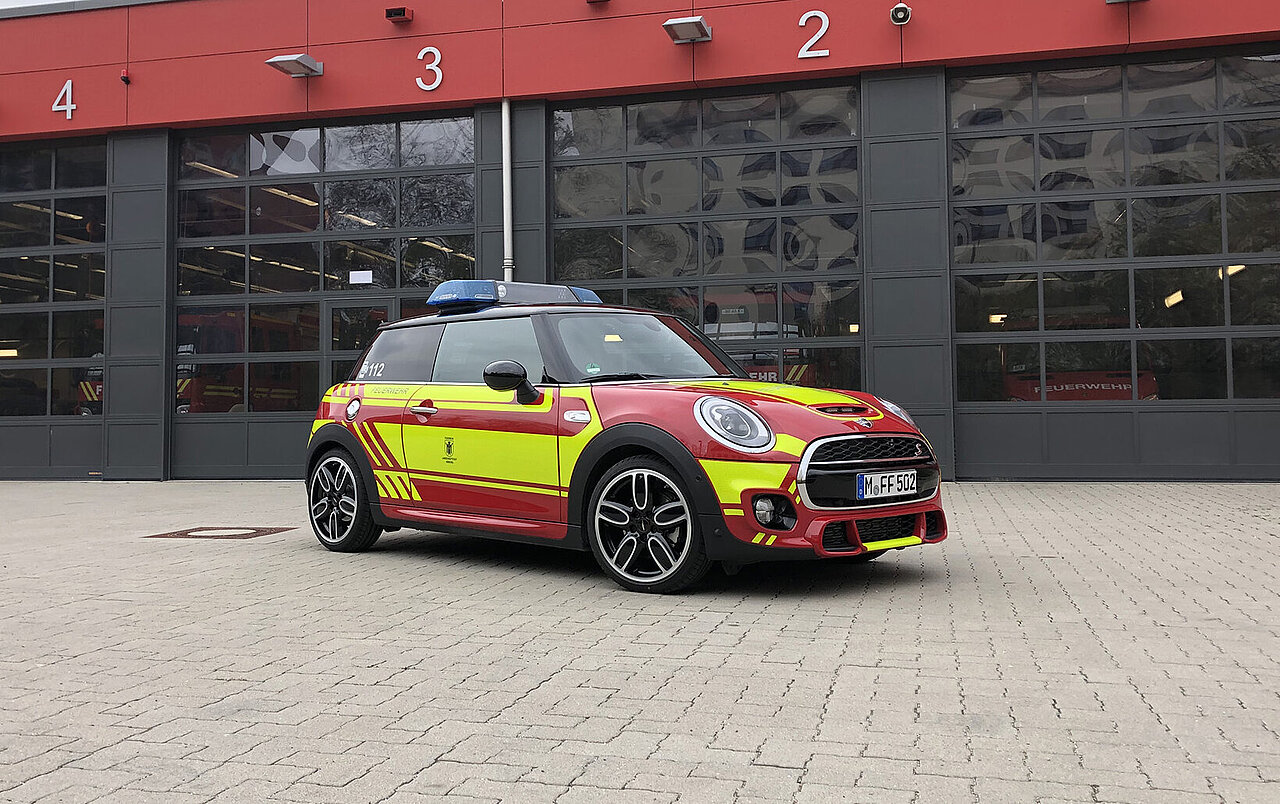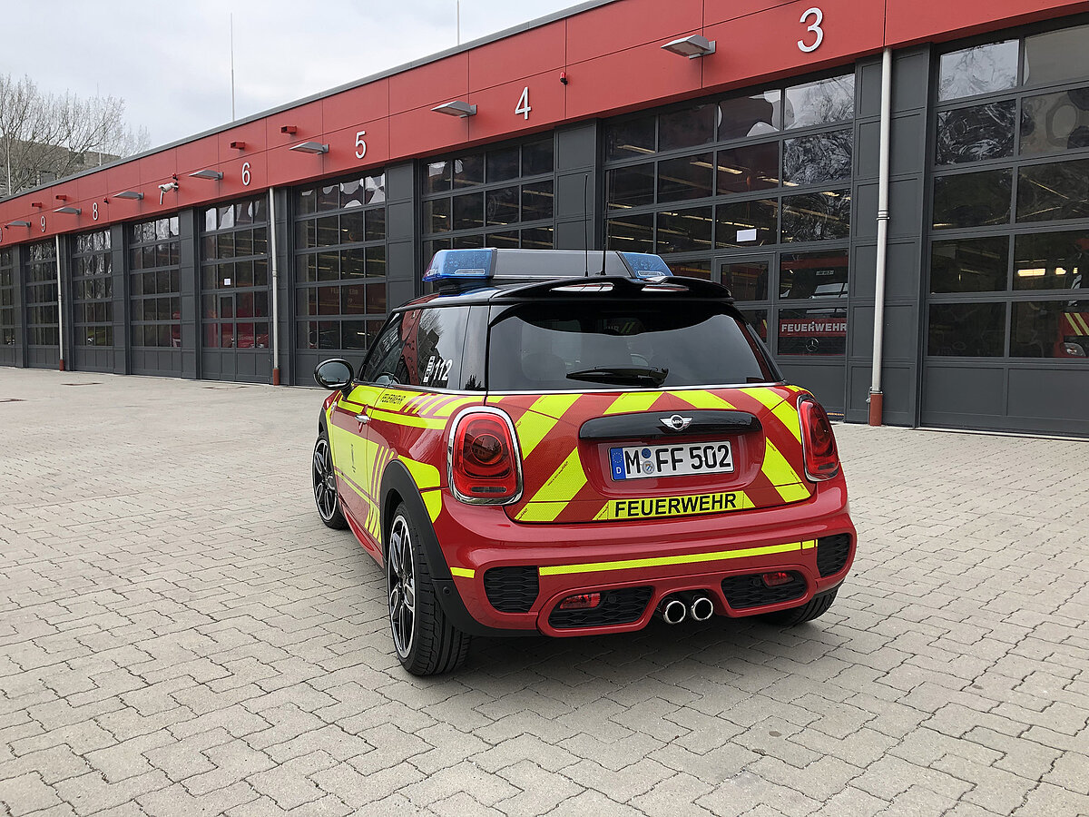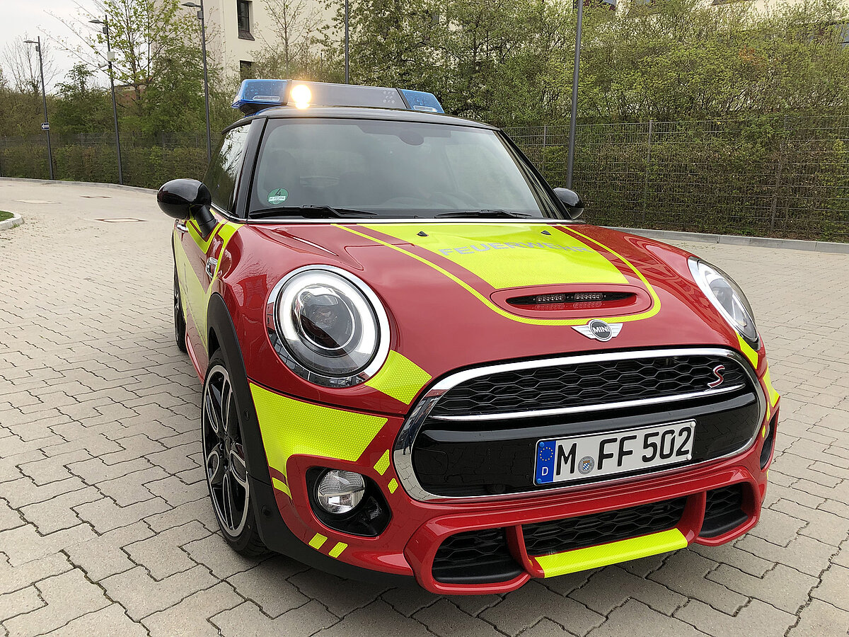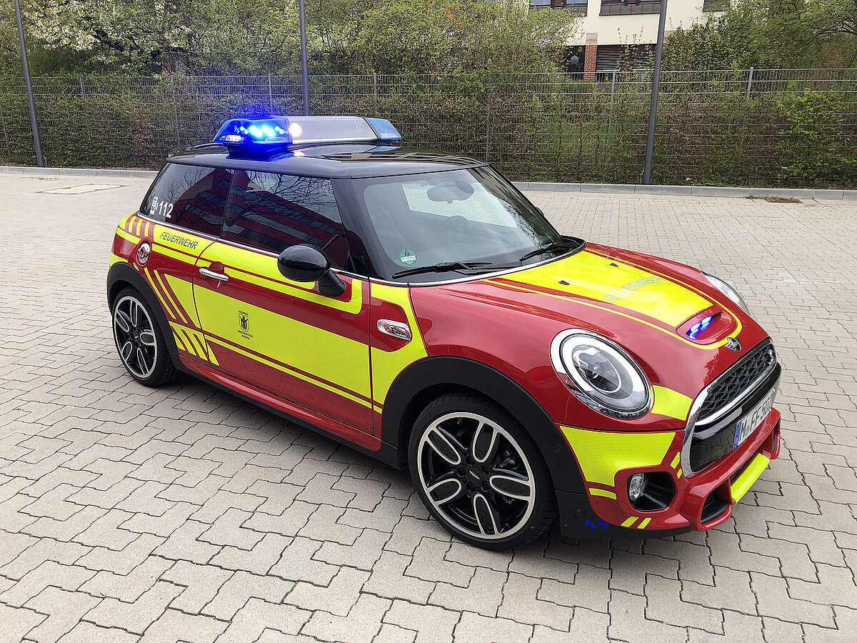 Der MINI gehört zum Fahrzeugpool der Stadtbrandinspektion der Freiwilligen Feuerwehr München.