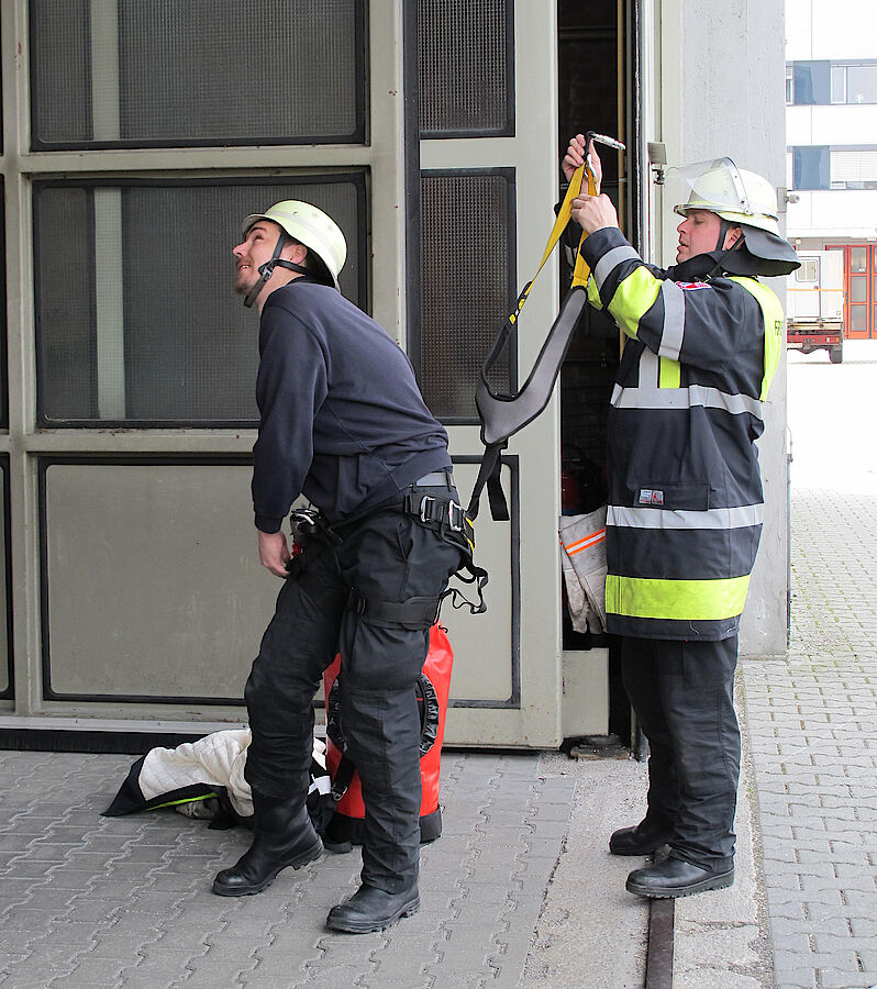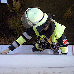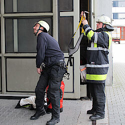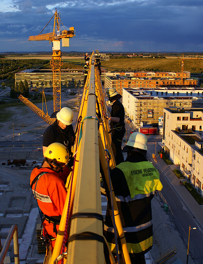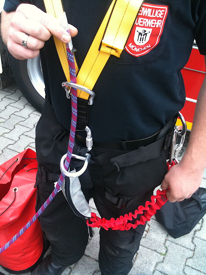 Die vorsteigende Person wird von zwei Personen gesichert, die sich in einem nicht absturzgefährdeten Bereich befinden oder selbst gesichert sind. Neben selbständigen Einsätzen unterstützen Feuerwehrmänner und Feuerwehrfrauen mit Absturzsicherung im Einsatz auch die Höhenrettungsgruppe der Berufsfeuerwehr München.