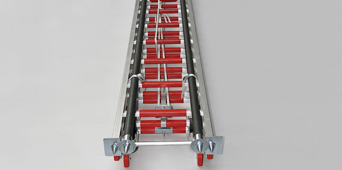 Allerdings ist das Gewicht trotz der Aluminiumbauweise mit 75 kg recht hoch, sodass die Leiter nur von vier Personen getragen werden kann. Für den Auf- und Abbau ist eine weitere Person erforderlich, die die Koordination übernimmt.