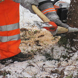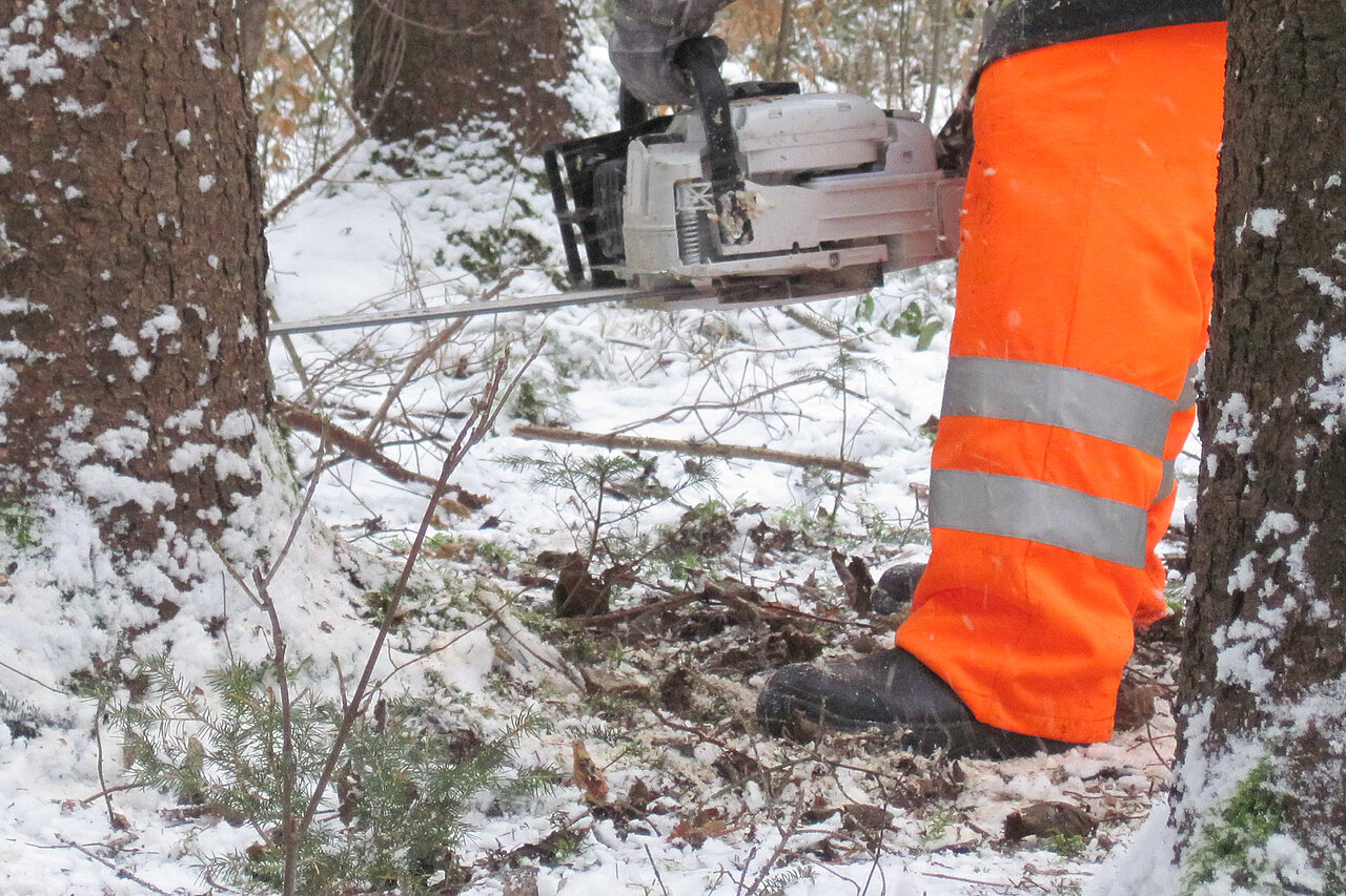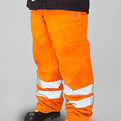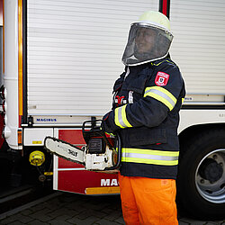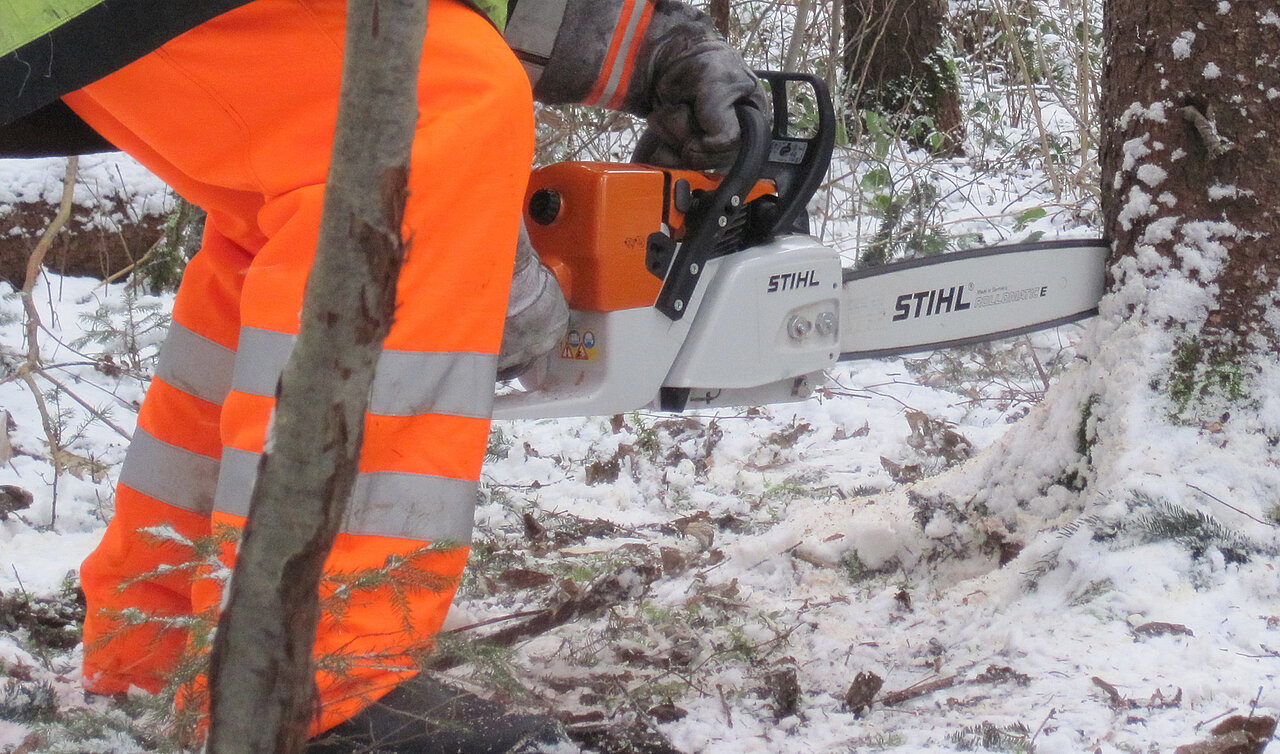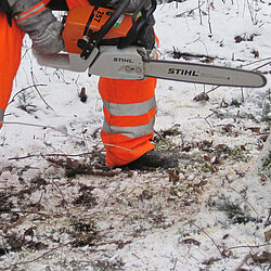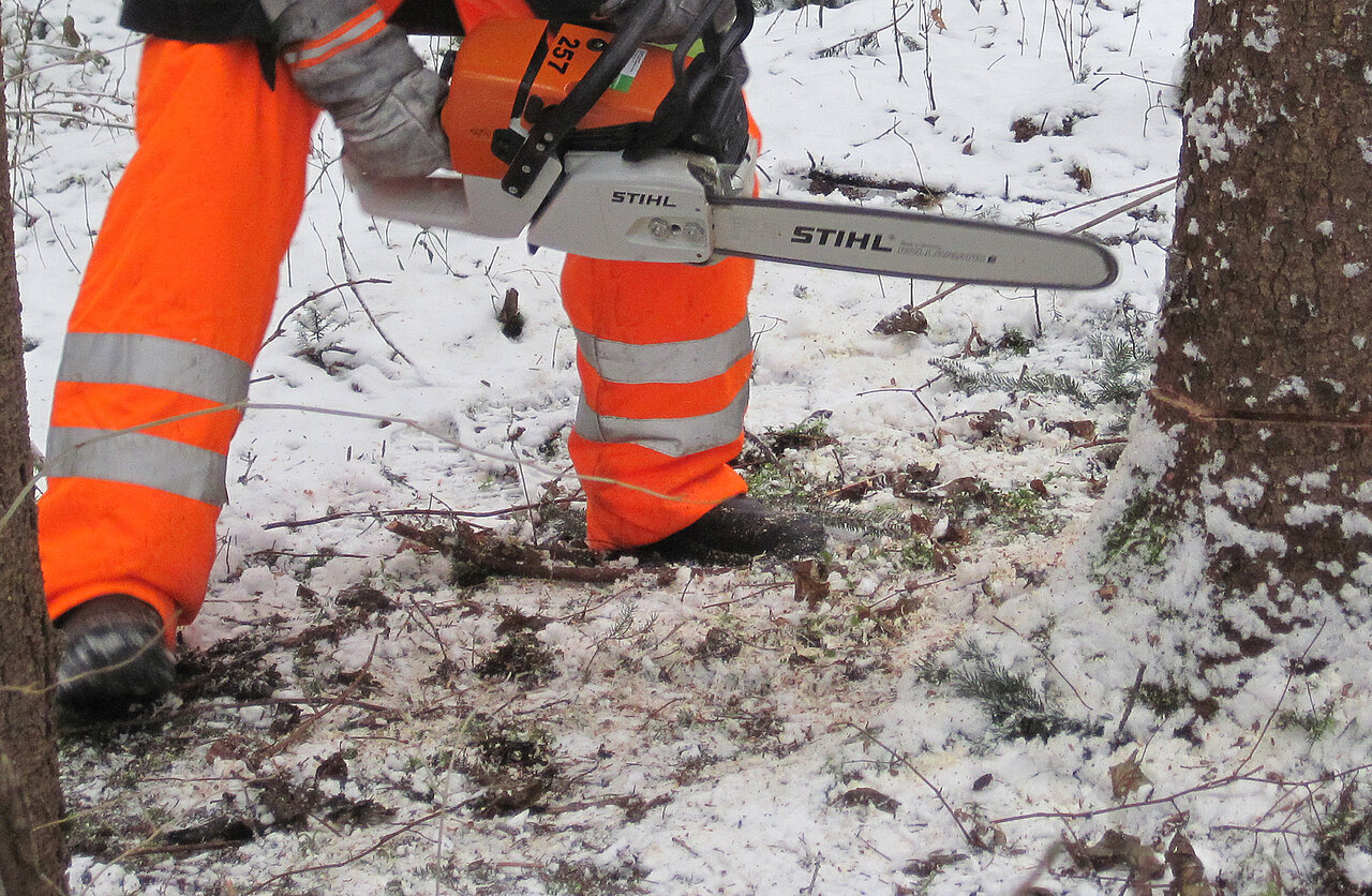 Bei Unwetterereignissen gehört die Arbeit an umgestürzten oder zum Teil entwurzelten Bäumen mit der Kettensäge zu den gefährlichsten Tätigkeiten der Feuerwehr, weshalb hierfür eine spezielle Ausbildung erforderlich ist. Zum besonderen Schutz werden bei allen Arbeiten mit der Kettensäge Schnittschutzhosen getragen. Sie sind aus einem Mischgewebe aus Baumwolle und Polyester gefertigt. Der Schnittschutz wird durch eingearbeitetes Endlosfasergewebe gewährleistet. Sobald die Kettensäge in das Material schneidet, blockiert in Sekundenbruchteilen die Kette.