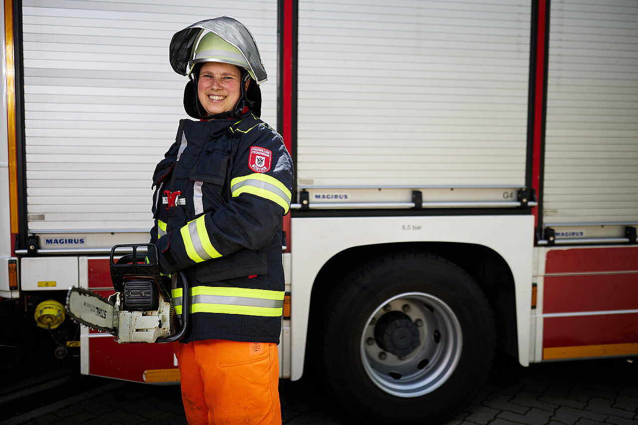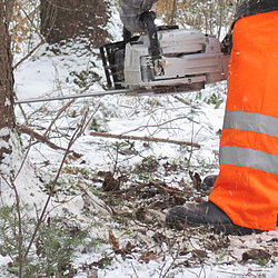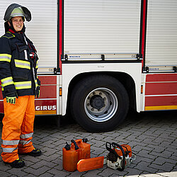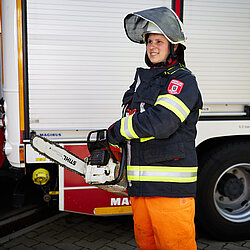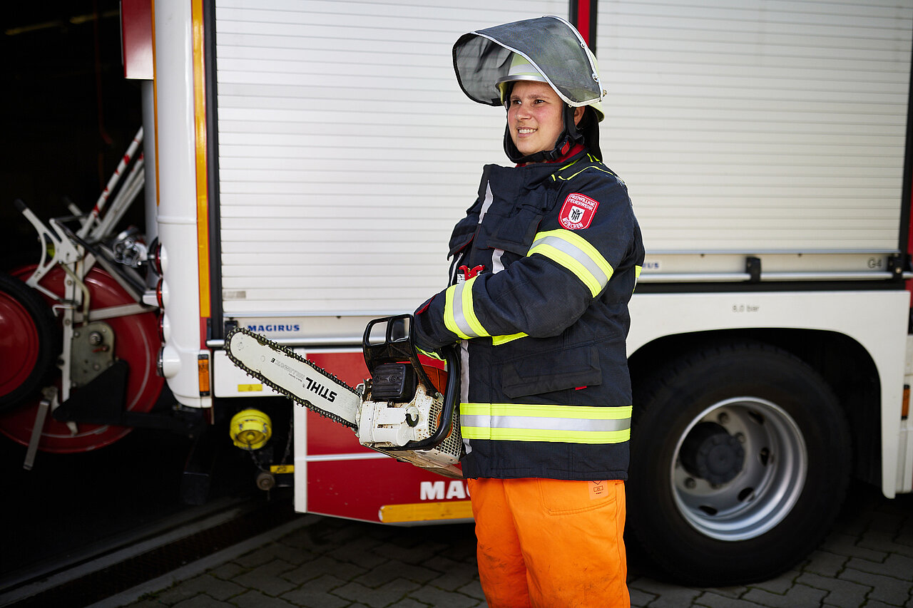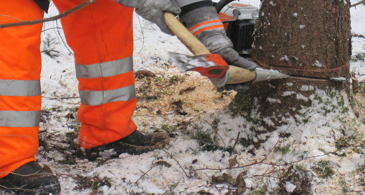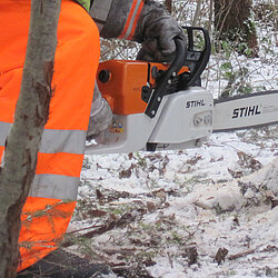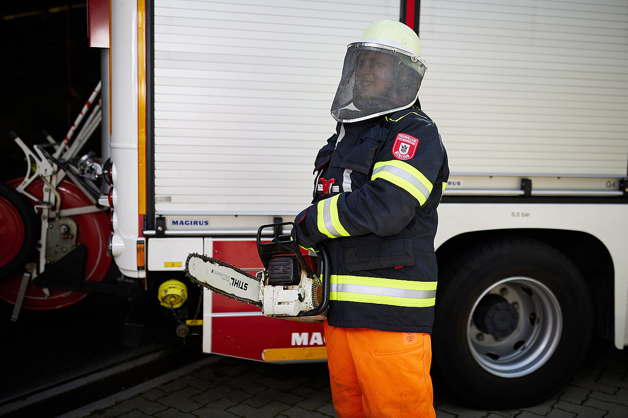 Bei Unwetterereignissen gehört die Arbeit an umgestürzten oder zum Teil entwurzelten Bäumen mit der Kettensäge zu den gefährlichsten Tätigkeiten der Feuerwehr, weshalb hierfür eine spezielle Ausbildung erforderlich ist. Zum besonderen Schutz werden bei allen Arbeiten mit der Kettensäge Schnittschutzhosen getragen. Sie sind aus einem Mischgewebe aus Baumwolle und Polyester gefertigt. Der Schnittschutz wird durch eingearbeitetes Endlosfasergewebe gewährleistet. Sobald die Kettensäge in das Material schneidet, blockiert in Sekundenbruchteilen die Kette.