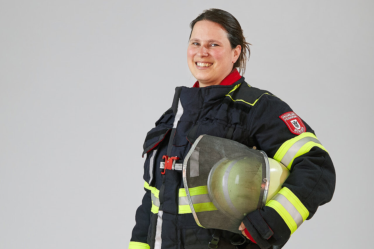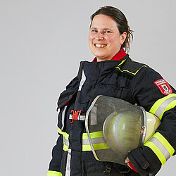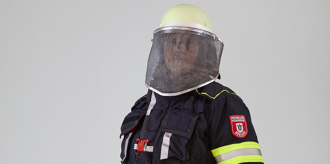 Zusätzlich trägt die Einsatzkraft ein Gesichtsvisier am Feuerwehrhelm, das aus einem feinmaschigen Metallgitter besteht. Es hat gegenüber den herkömmlichen Kunststoffvisieren den Vorteil, nicht zu beschlagen und einen größeren Bereich von Gesicht und Hals zu schützen.