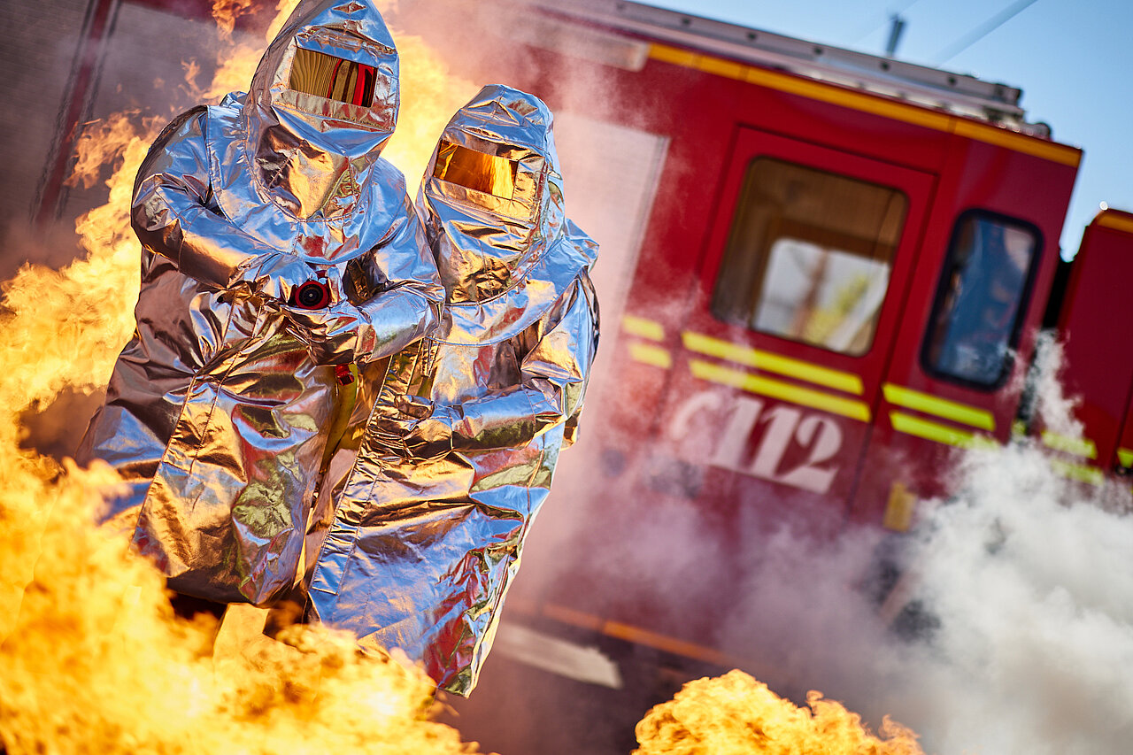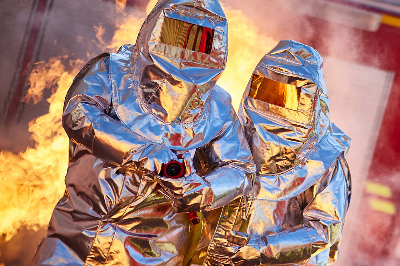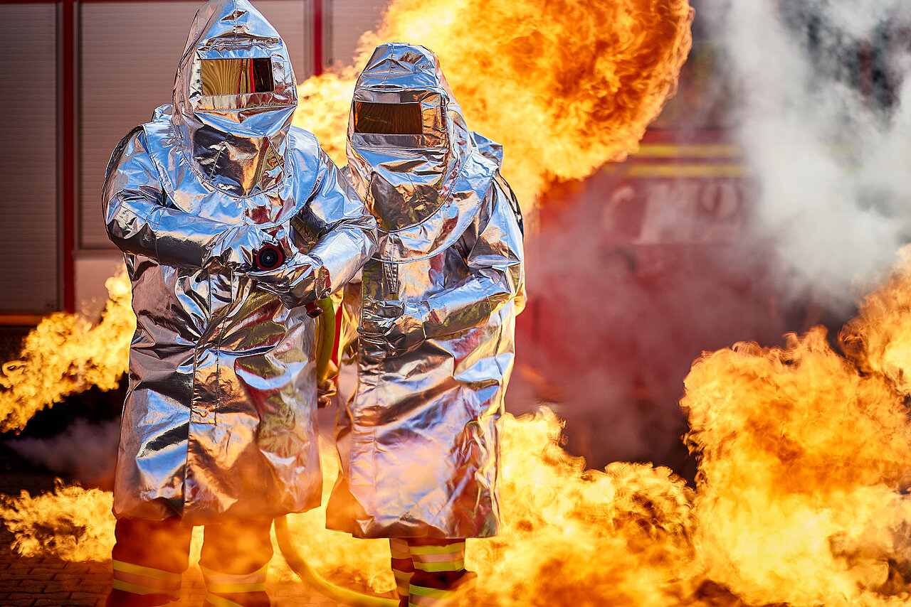 Das aluminisierte Obermaterial der Hitzeschutzkleidung reflektiert einen Großteil der Wärmestrahlung und schützt besonders gut vor Flammen sowie extremer Hitzestrahlung und sogar vor flüssigem Metall. Dadurch erlaubt die Hitzeschutzkleidung näher und länger an einen besonders heißen Brandherd heranzutreten, um ihn zu löschen. Getragen wird die Schutzkleidung über einer Atemschutzausrüstung.
