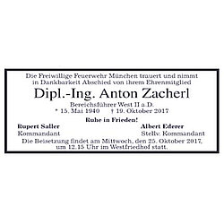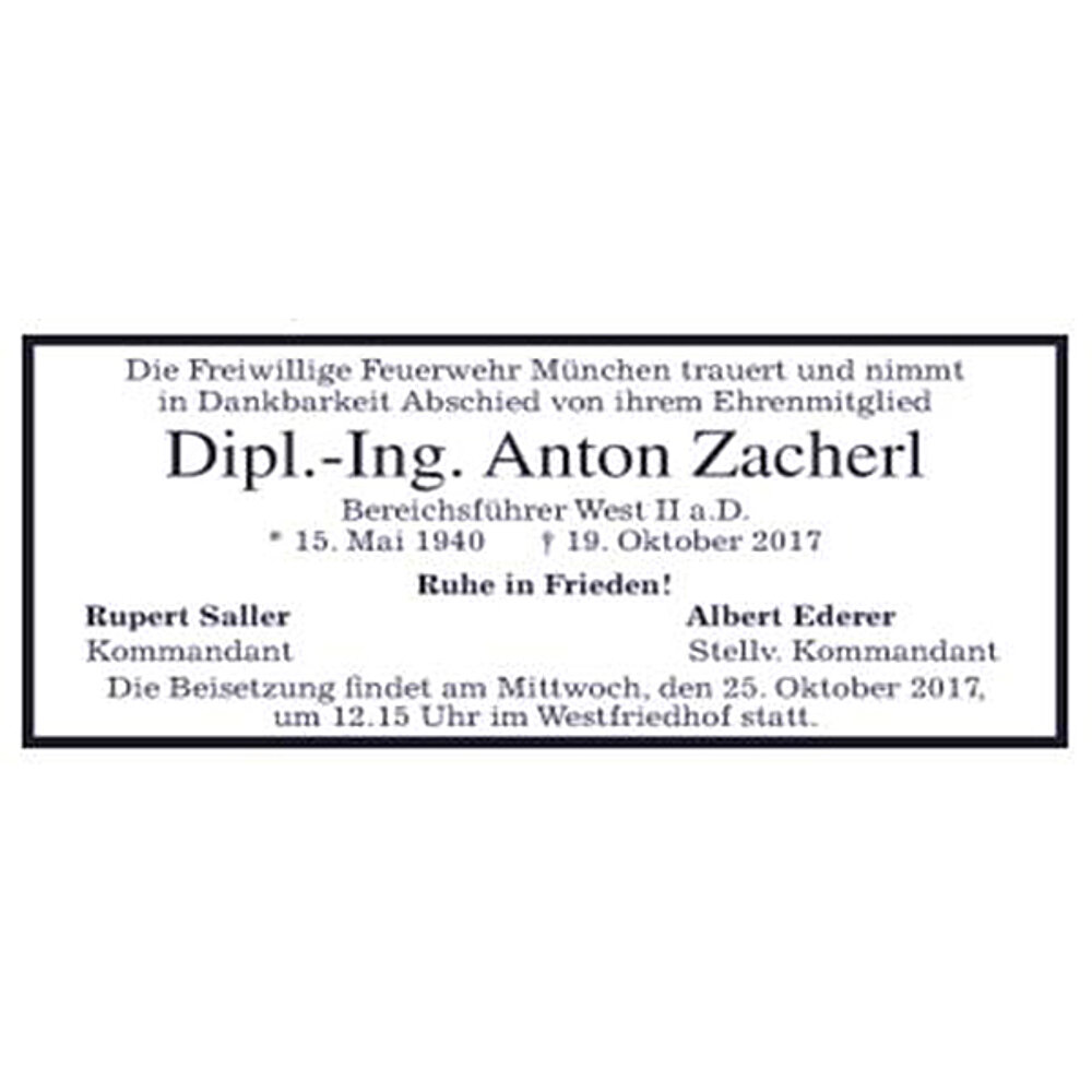 Am 19. Oktober 2017 ist unser ehemaliger Bereichsführer West II, Herr HBM a.D. Anton Zacherl im Alter von 77 Jahren verstorben. Die FF München nahm beim Begräbnis im Münchner Westfriedhof Abschied.
