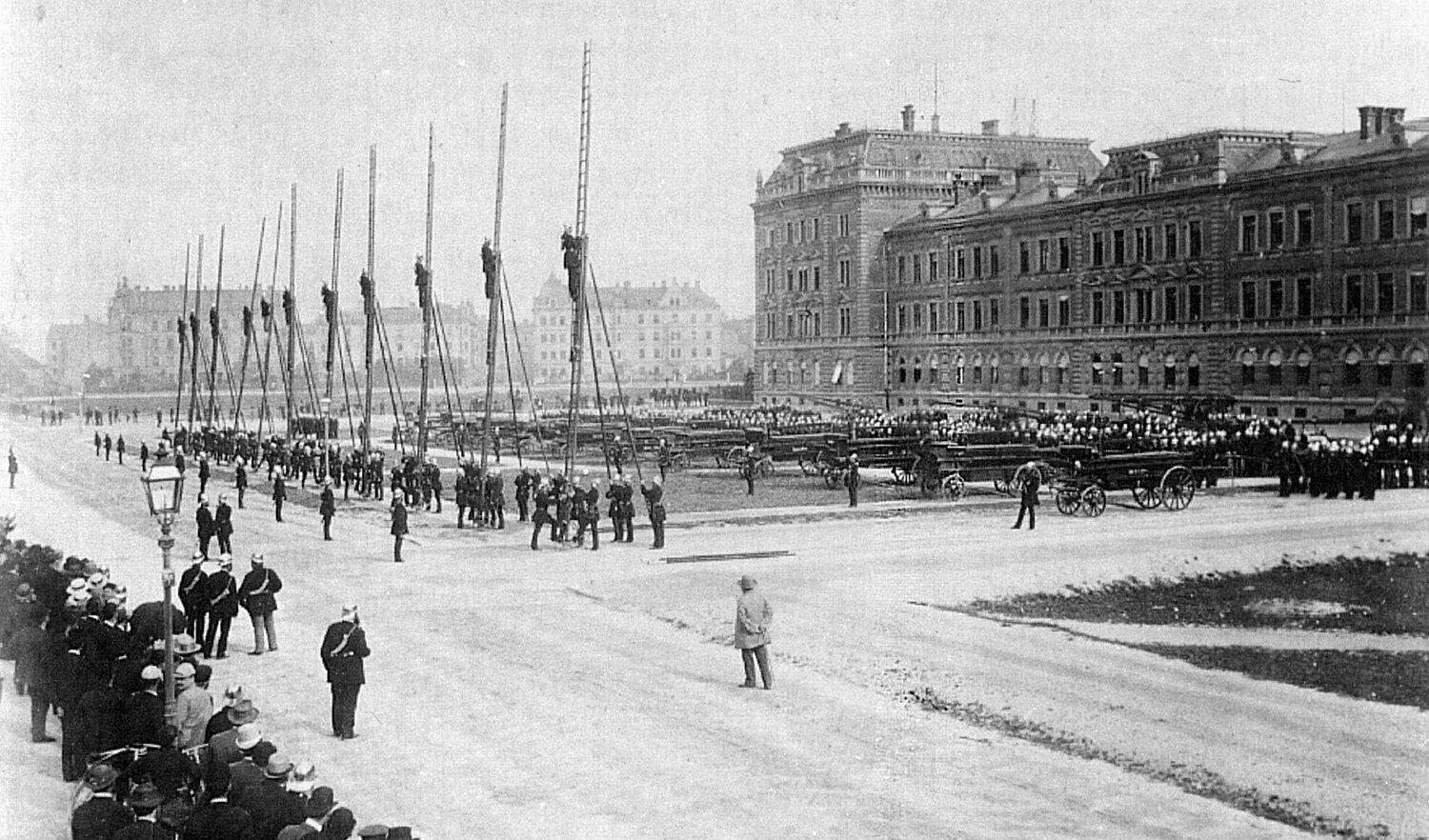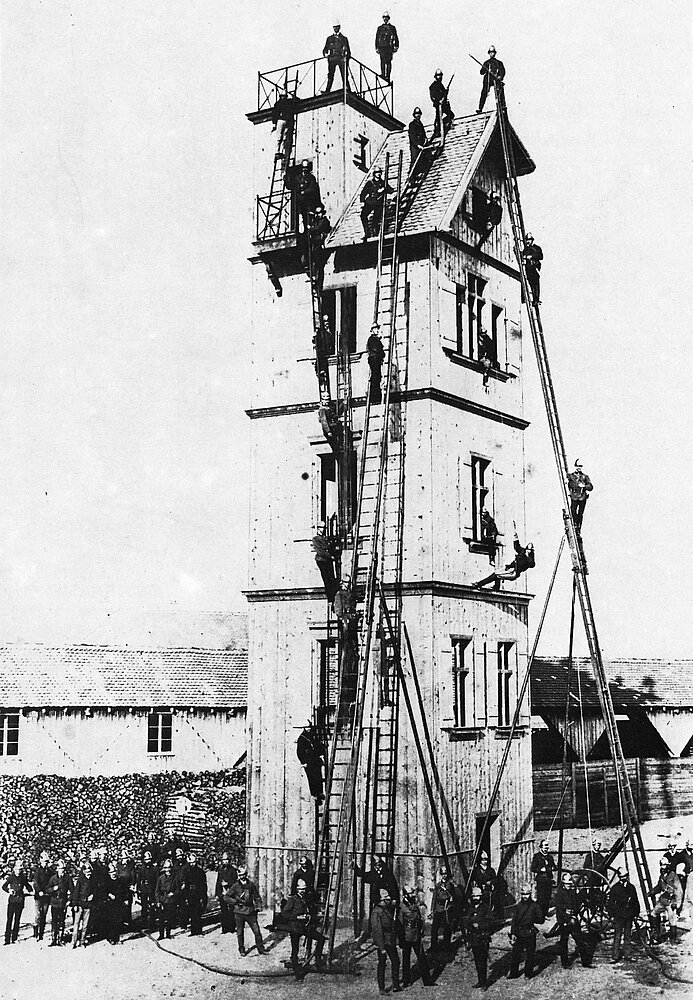 Die Gründung der Freiwilligen Feuerwehr wird vollzogen. Freiwillige und Städtische Feuerwehr arbeiten fortan eng zusammen. Die Freiwillige Feuerwehr hat ein Jahr nach ihrer Gründung schon 400 Mitglieder und genießt höchste Anerkennung in der Gesellschaft. So ist es noch heute. Im Bild eine Übung an einem Steigerturm.