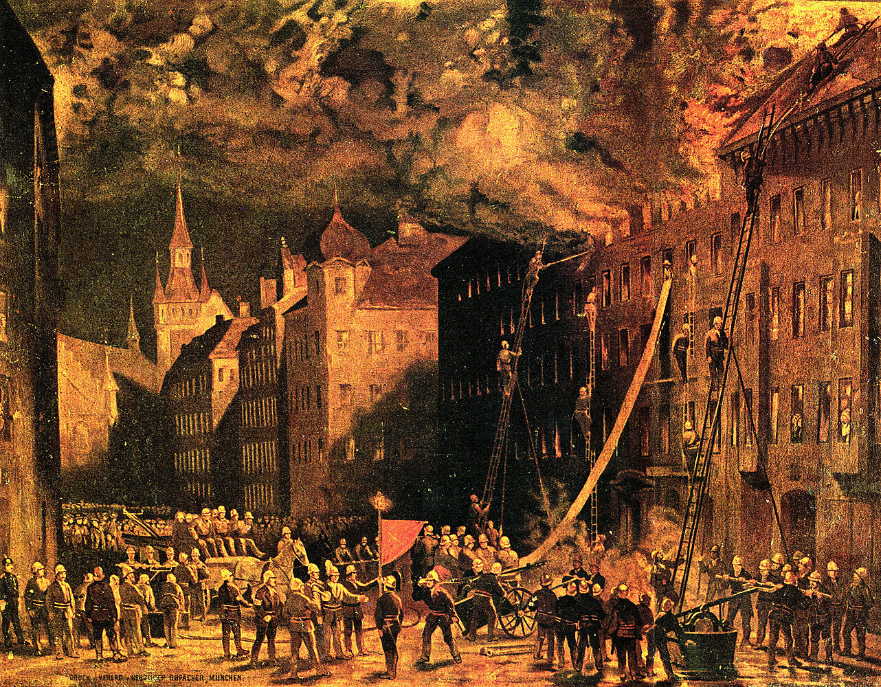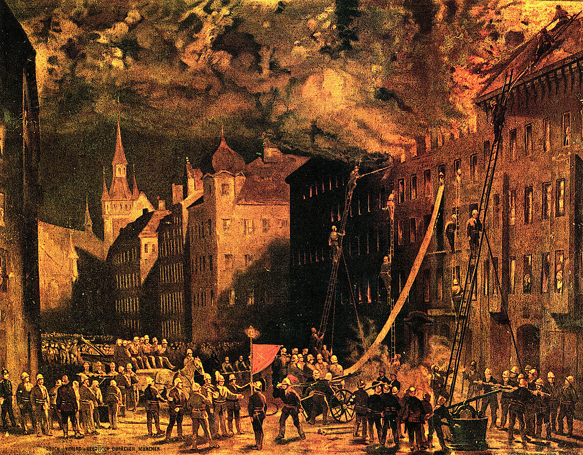 Das Kaufhaus Merk am Marienplatz (vormals Poschinger) brennt in der Nacht vom Keller bis zum Dach. Zahlreiche Einsatzkräfte der Freiwilligen Feuerwehr München waren im Einsatz. Auf dem Gemälde führt der Oberkommandant – erkennbar an der roten Fahne – den gemeinsamen Einsatz.